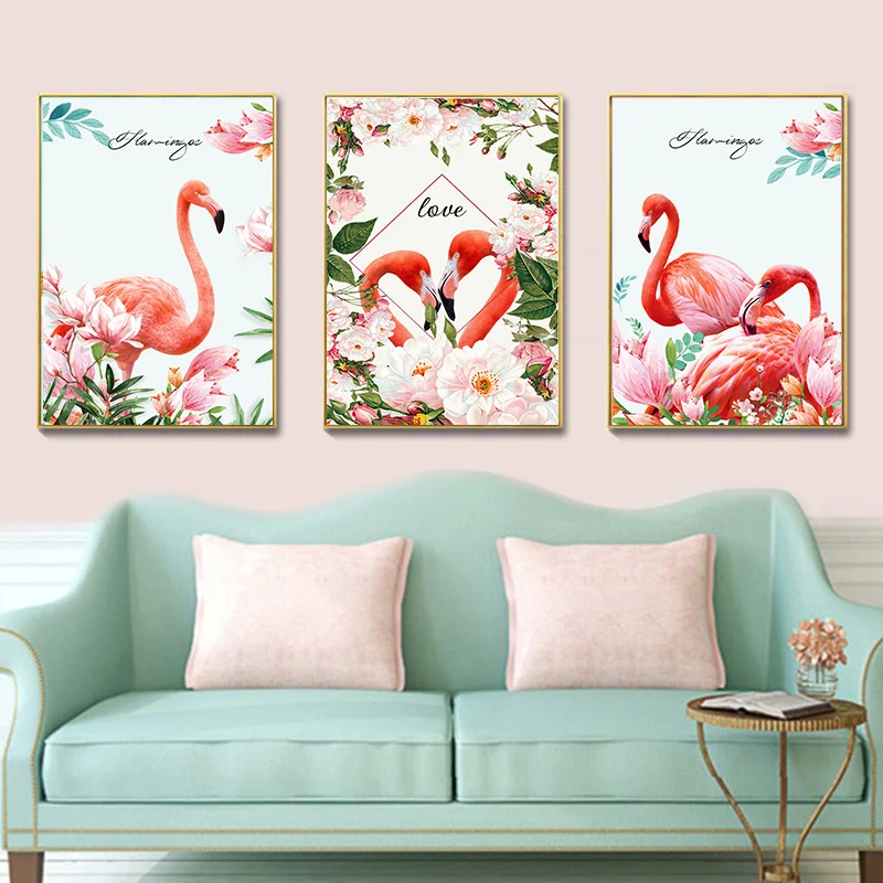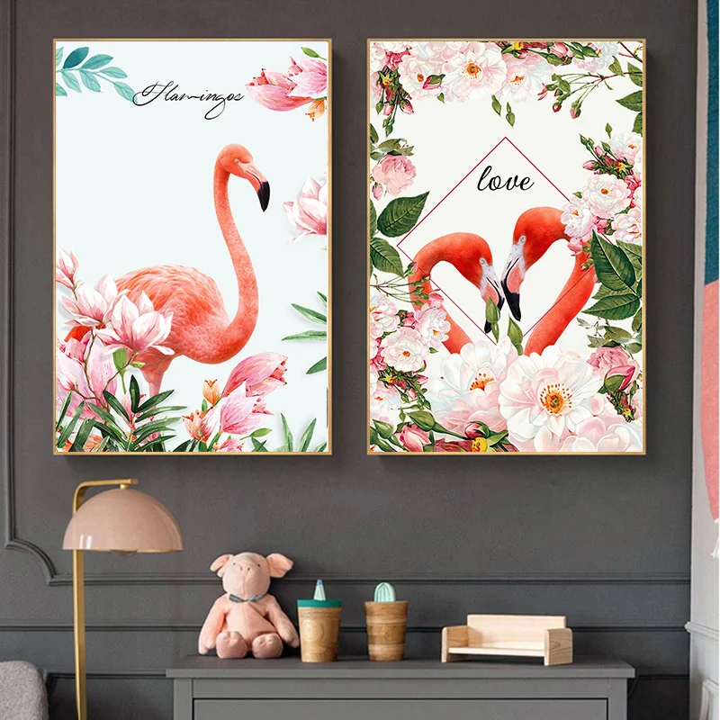 Постер на холсте с изображением розовых романтических фламинго, цветов, настенная живопись, картины для домашнего декора для гостиной, спальни