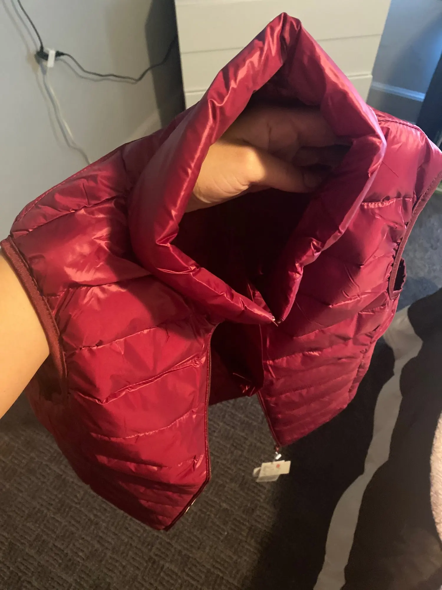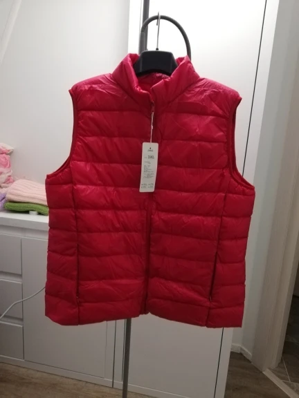 очень хорошая жилетка. Лёгкая, тёплая. Цвет нежный жемчужный. на ОГ90 размер xxl отлично сел. доставка была долгой, где-то на нашей почте застряла посылка. Но в итоге заказ получили, спасибо продавцу.