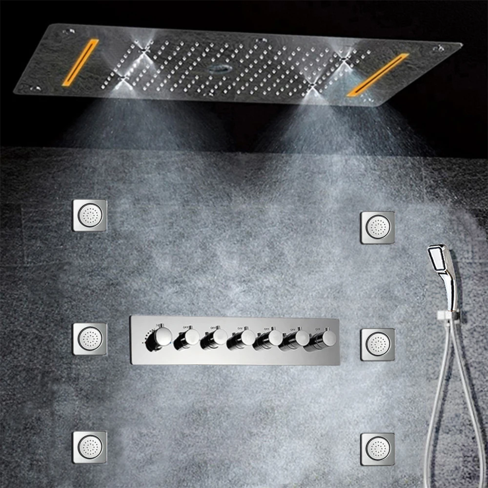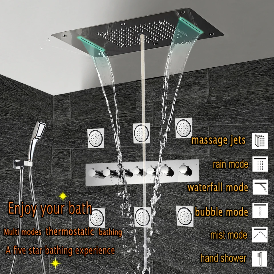 Новый стильБольшой потокЛатунный душевой набор 6 функций термостатический Миксер с светодиоды для потолка в душе головка 700x380 мм дождевой водопад пузырьковый туман с массажными струями SC5422