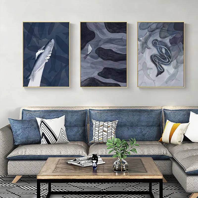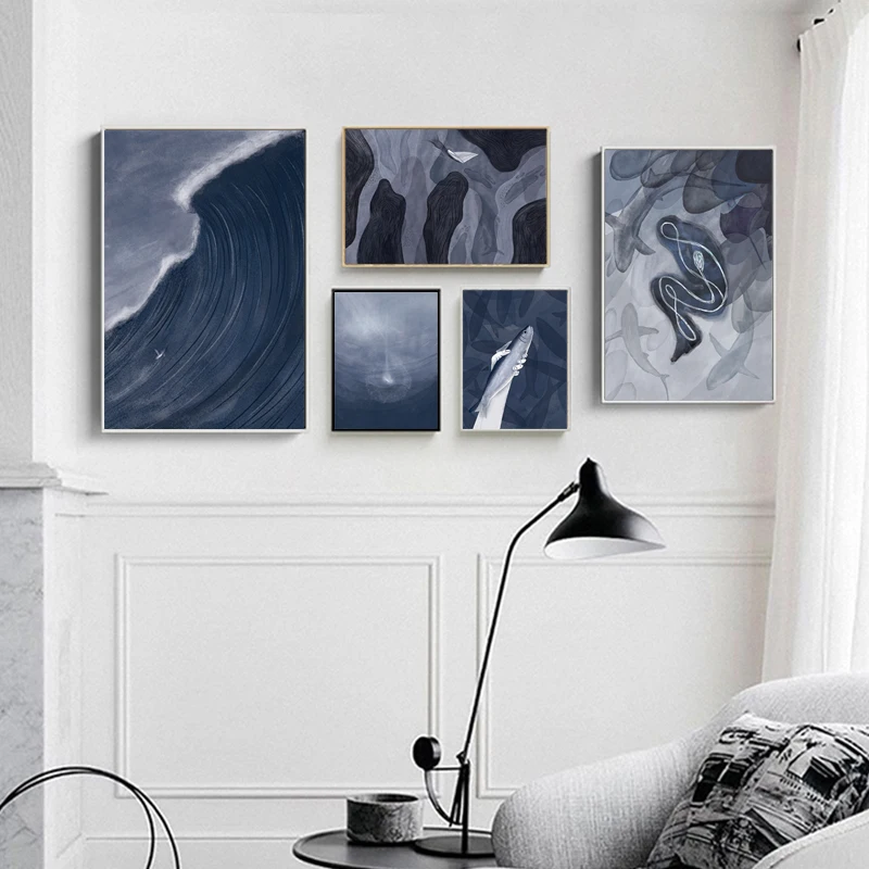 Скандинавский стиль морские и рыбки, холст, живопись, абстрактные линии, настенная художественная фигурка, плакаты, принты для интерьера