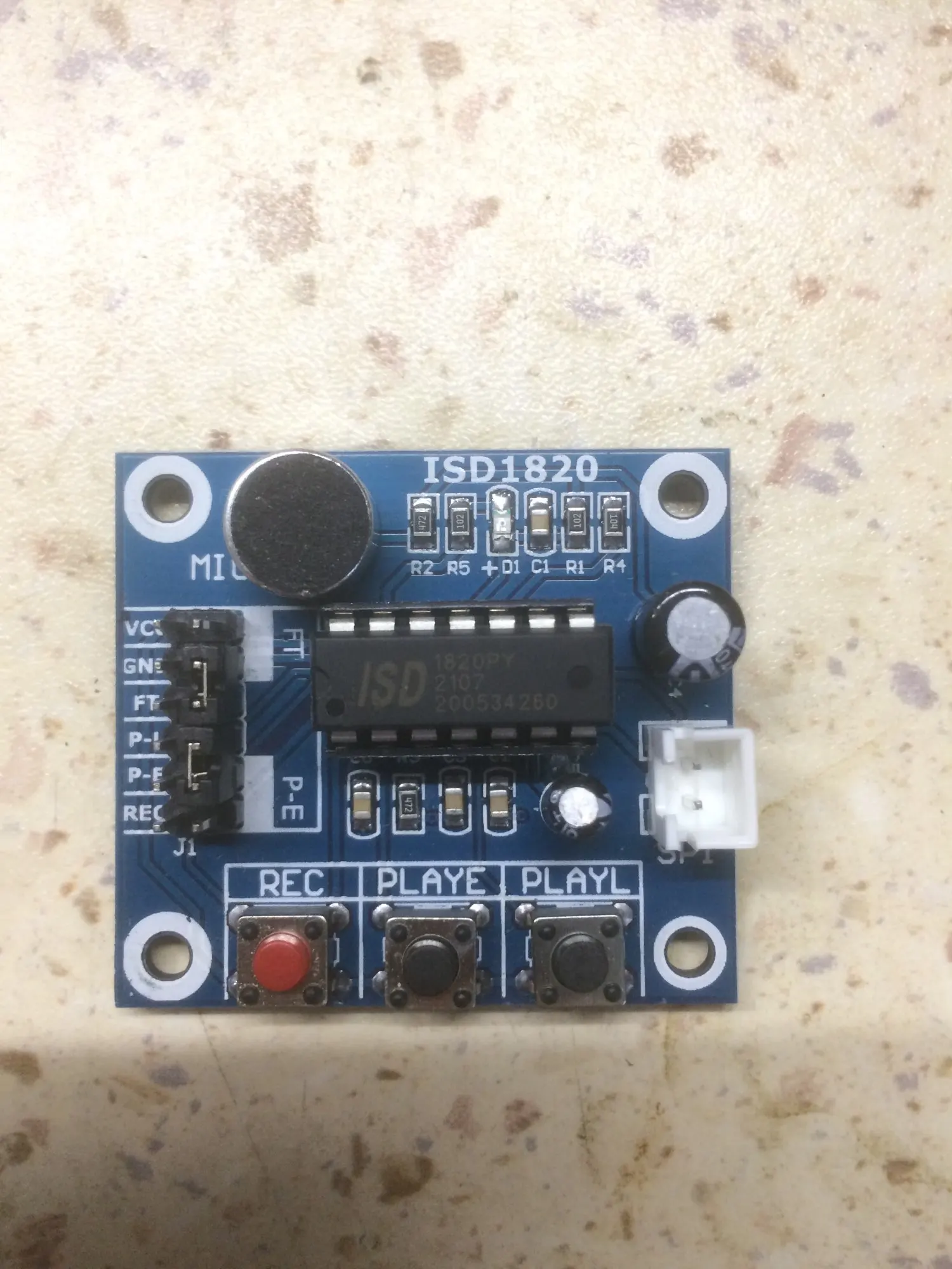 ISD1820 модуль записи голосовой модуль Голосовая плата модуль телетелефона плата с микрофонами + громкоговорительХарактеристика:С looping, jog play, функция однопроходного воспроизведенияДоступно управление одним чипомЭтот модуль может непосредственно водить маленькая колонка 8 Ом 0,5 WРабочее напряжение: от 3 до 5 В постоянного токаГромкоговоритель: 8Ω, 0,5 WИсточник питания: 3 - 5 ВРазмеры: 3,7x4,1 см/1,45x1,61 дюймов