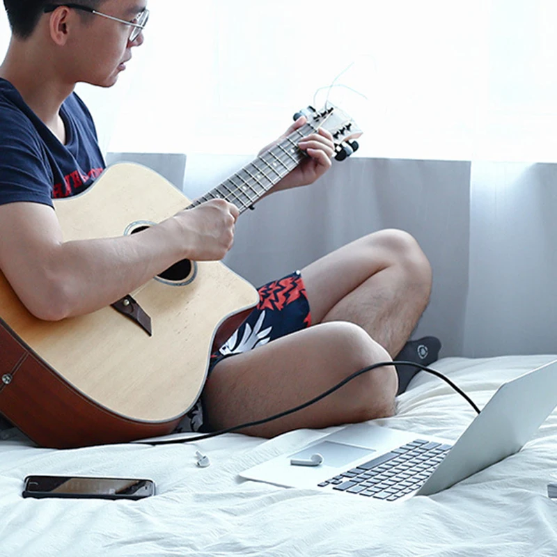 Двойной аудио кабель: мобильный телефон, компьютер, аудио можно использовать. Компьютер подключен к аудио, гитара подключена к компьютеру, мобильный телефон подключен к аудио.