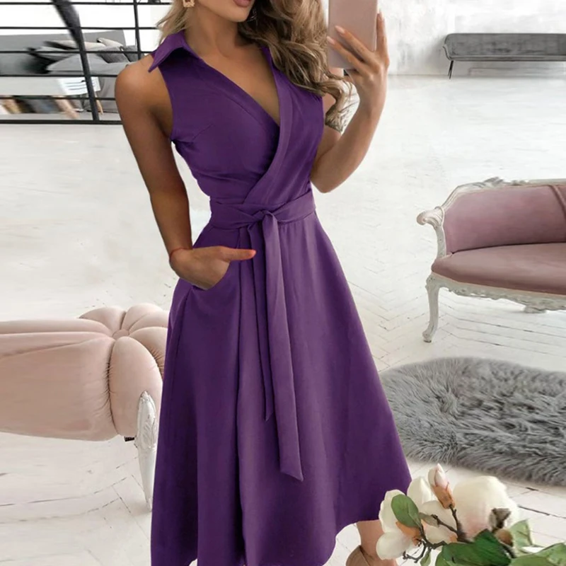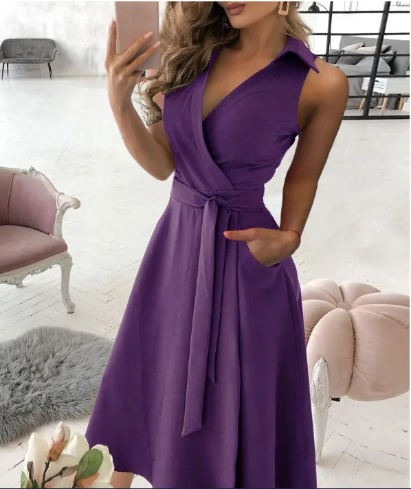 2021 Элегантные Женские однотонные платья для вечеринок, летние модные сексуальные платья-трапеции с V-образным вырезом и поясом, женские повседневные платье Бохо без рукавов