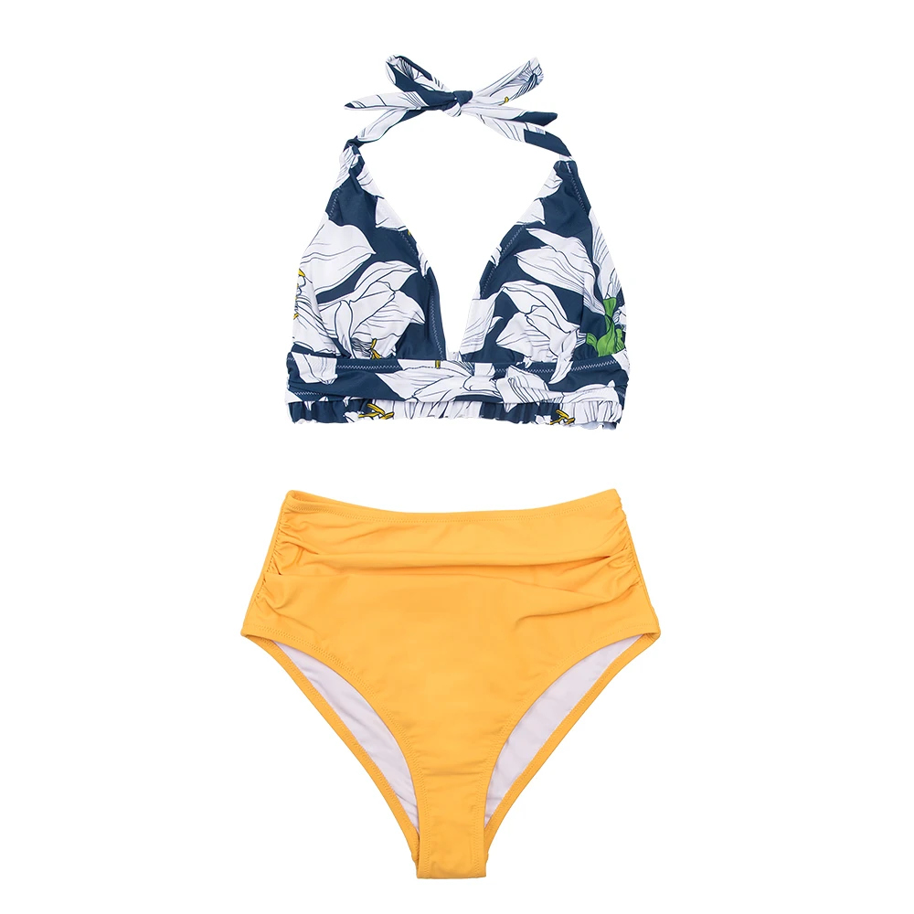 Купальник бикини женский желтый с цветочным принтом и высокой талией