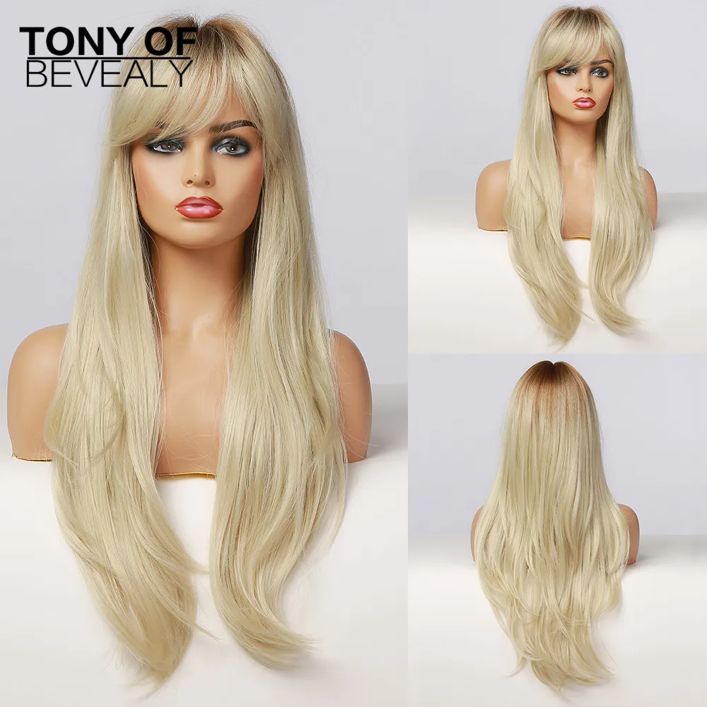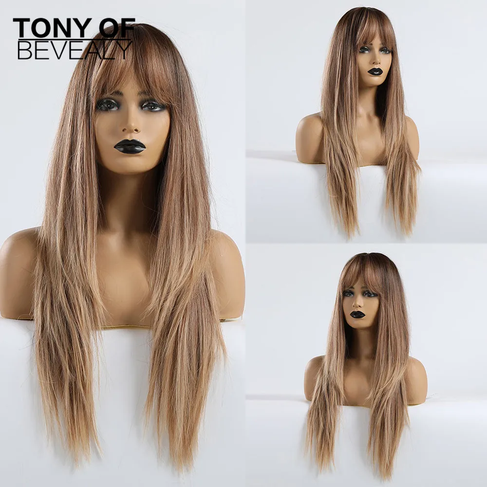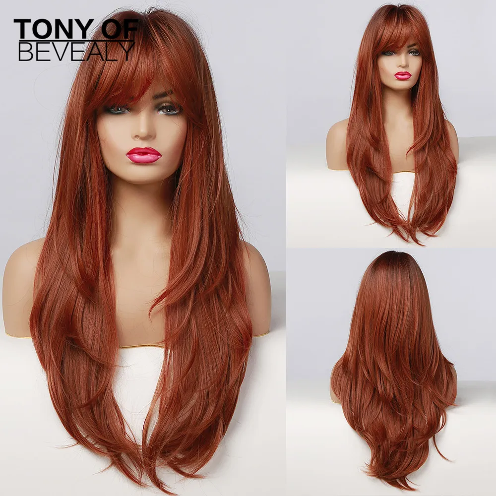 Длинные прямые красно-коричневые синтетические волосы парики с челкой для женщин афро, термостойкие волоконные темные корни, натуральные пушистые парики