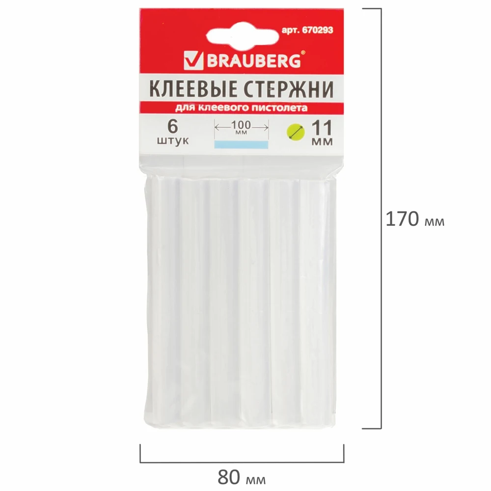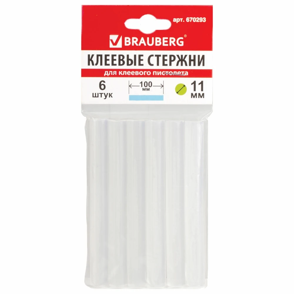 Стержни клеевые BRAUBERG 670293, диаметр 11 мм, длина 100 мм, прозрачные, комплект 6 шт, европодвес