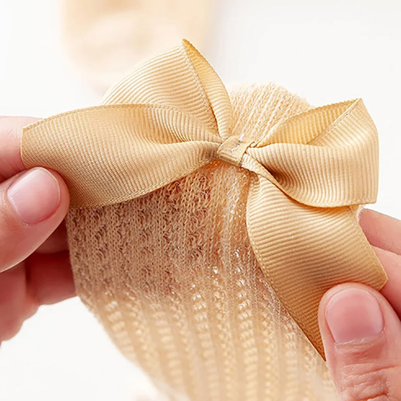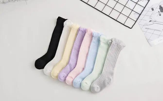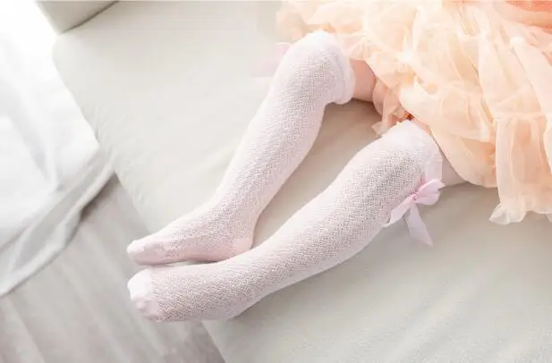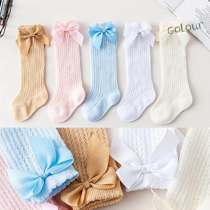Носки для новорожденных девочек, летние хлопковые колготки для младенцев, гольфы до колена для младенцев, носки с бантами и помпонами, детские чулки
