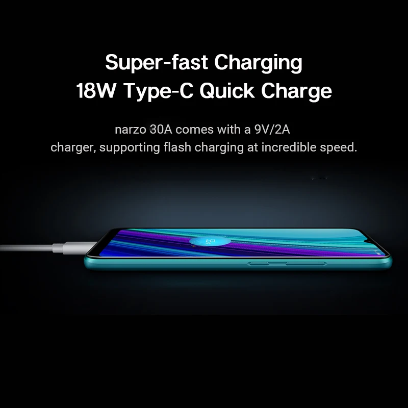 Narzo 30A поставляется с зарядным устройством 9 В/2 А, поддерживающим зарядку вспышкой на невероятной скорости.