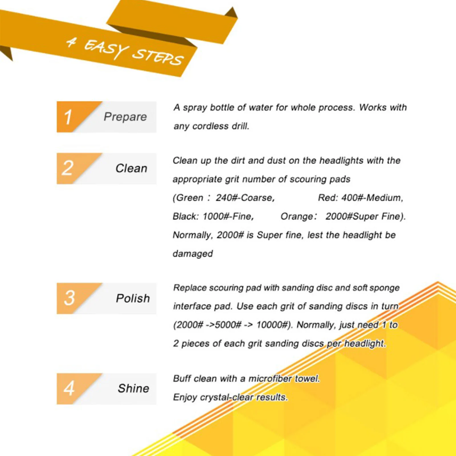 Описание:Нет необходимости в реставраторе и протекторе во время эксплуатации, просто заполните воду.Полировальные диски и шлифовальные диски являются водонепроницаемыми и многоразовыми.Всего 3 необходимых шлифовальных диска (P2000, P5000, P10000) на лампу, этот комплект используется для 4 ламп.Сначала используйте швабру, затем наждачную бумагу.Принцип-от низких частиц до высоких частиц (P240-P400-P1000-P2000-P5000-P10000).