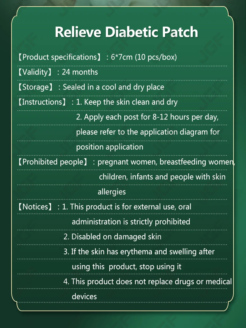 Пластырь для диабетиков с сахаром в крови KONGDY предназначен для лечения локализованных диабетических периферийных устройств, помогает облегчить симптомы, вызванные диабетической невропатией, такие как глубокая боль, одышка, плохая память, частое мочеиспускание, онемение и боль в конечностях. При трансдермальном лечении, при наличии побочных эффектов, таких как непереносимость некоторых компонентов, вы всегда можете остановить лечение.