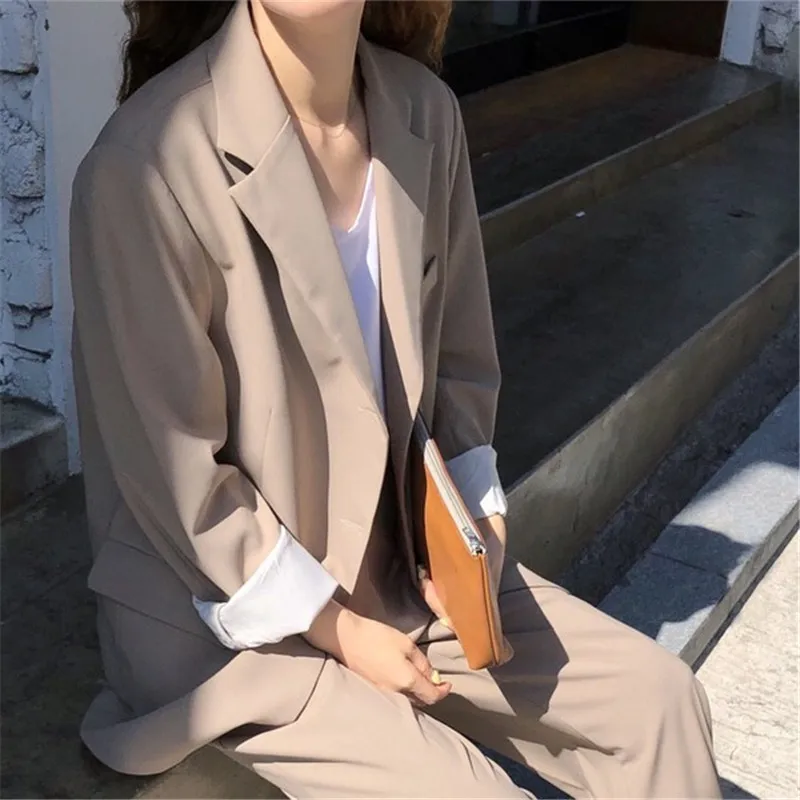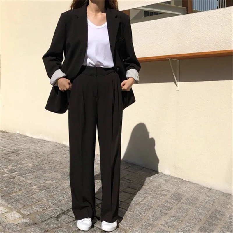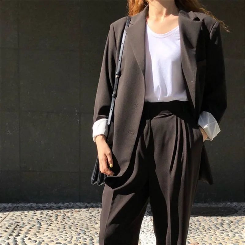 Костюм брючный женский винтажный, повседневный свободный пиджак и длинные брюки, Офисная форма, костюм, пальто, весна-осень