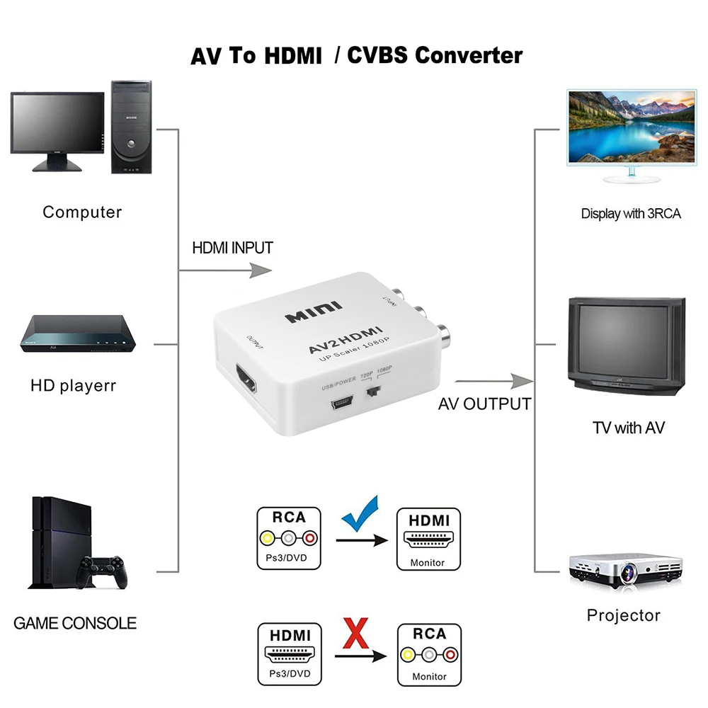 Этот мини AV/CVBS в HDMI конвертер является универсальным преобразователем для аналогового композитного входа в HDMI 1080p (60 Гц) выход