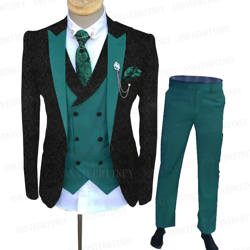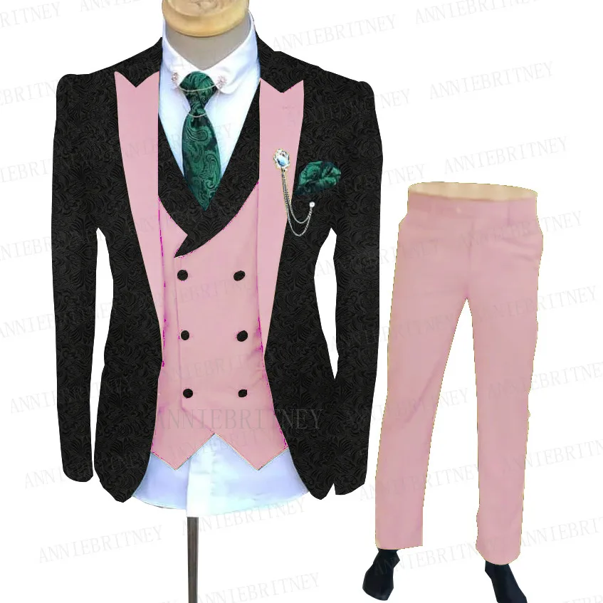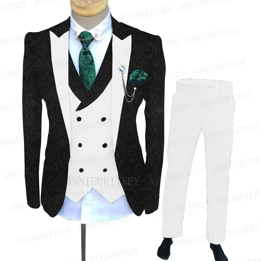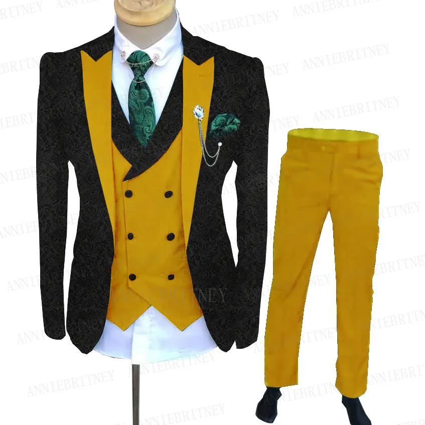 Мужской жаккардовый костюм, черный костюм с бежевыми жилетом и брюками, 3 предмета, индивидуальный пошив, модный деловой смокинг, свадебные костюмы для жениха, 2021