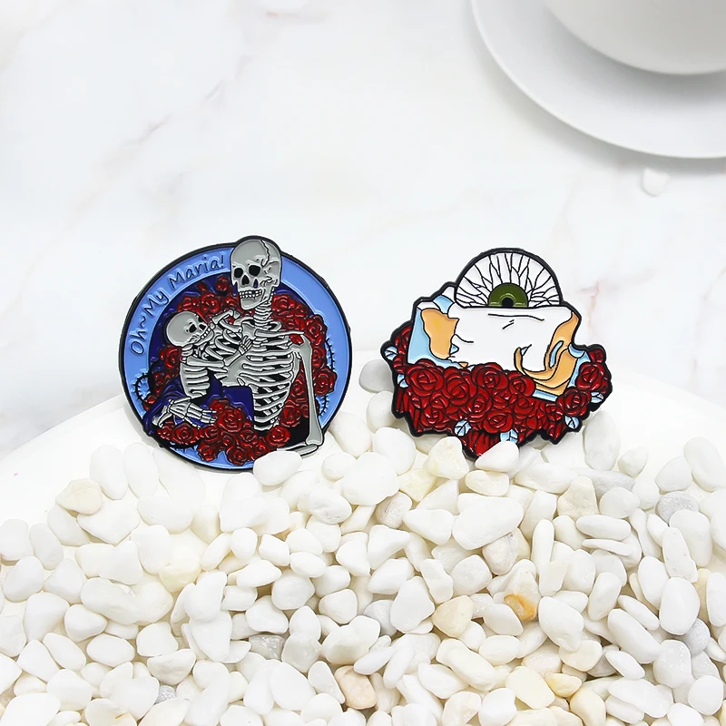 Роза, цветок, скелет, глаза, красный цвет, фотоэлемент, о моя Мария! Эмалированная булавка с черепом, косточками, зеленой рукой, зомби, любовь, ювелирные изделия