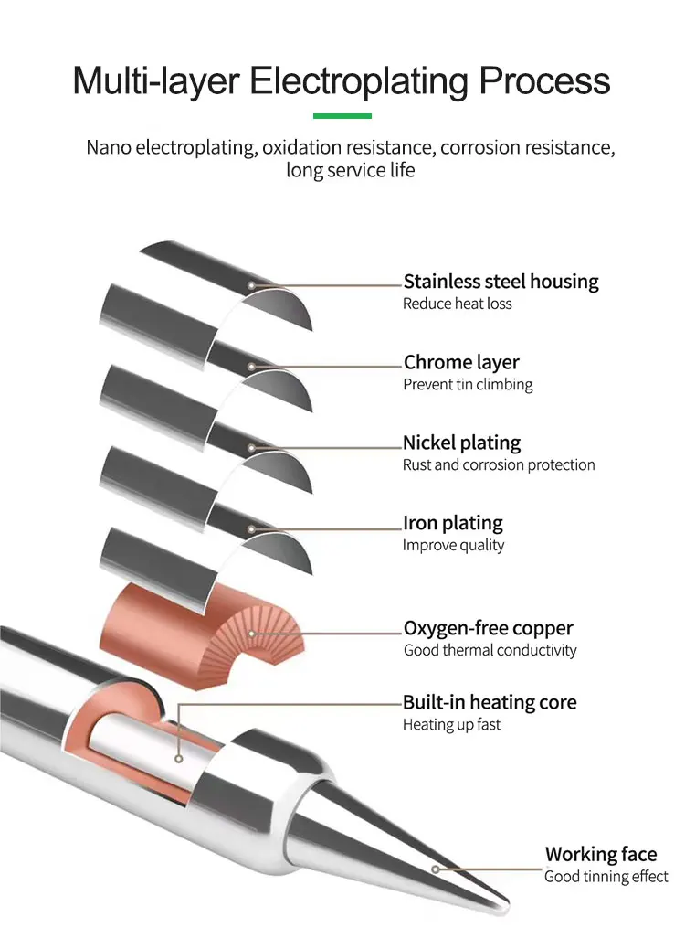 1. Подходит для C210/T26 2. Быстрый нагрев, быстрая теплопроводность, легко ловить 3. Обработка наконечниками с луженым покрытием, легко оловить во время пайки и эффективно предотвратить окисление 4. После специальной обработки эффект заранее от нагрузки олова хороший, нагрузка олова гладкая, стойкость к окислению высокая