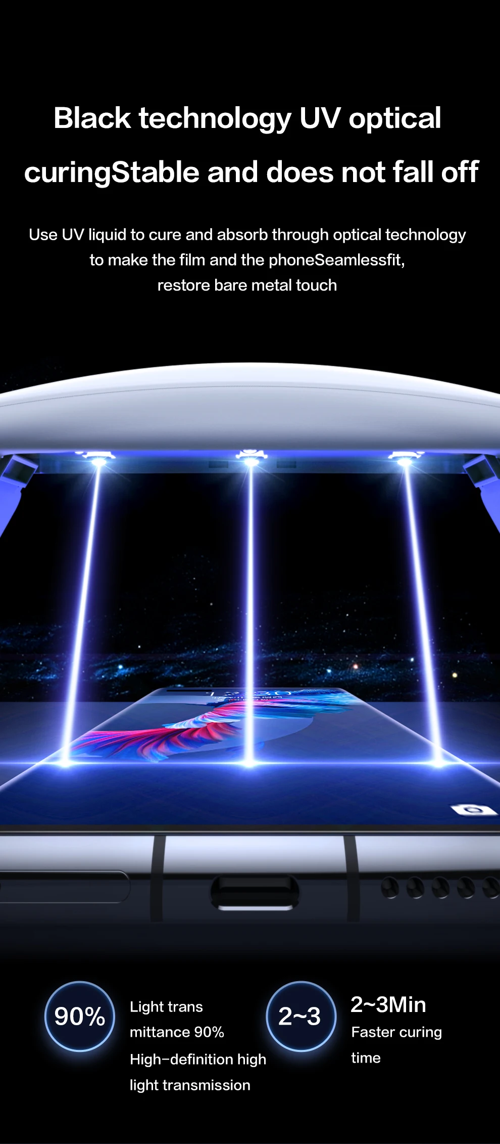 19. Подключите питание и включите УФ-светильник20. Проведите влево и вправо, пока светильник не погаснет автоматически, чтобы он равномерно просвечивал на экране, чтобы высушить клей21. Аккуратно нажмите на экран пальцами и снимите установочную рамку вертикально вверх22. После удаления рамки протрите клей, который проливается вокруг экрана23. Включите УФ-светильник, чтобы осветить обе стороны изогнутого экрана24. Готовый