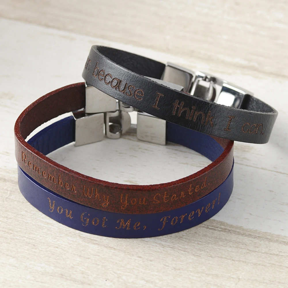 Стиль изделия: плетеный браслетМатериал: нержавеющая сталь + кожаЦвет: синий/черный/коричневыйРазмер: длина кожи: 18 см ---- 25 см вы выбираетеПоддержка местного языка: текст, имя, логотип, номер телефона, буквы, фразы,...Кроме того, мы можем гравировать звуковые волны, Морзе, ЭКГ, координаты, девиз, фраз и т. Д.