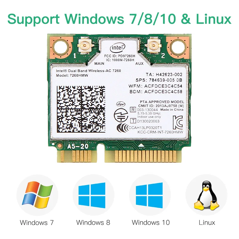 Состояние: абсолютно новыйМодель: 7260HMWТип: 802.11ac и для Bluetooth 4,0Поддержка операционных систем ed: Windows 7/8/10 (WinXP и Vista Linux не поддерживаются)(Половина MINI PCI-E. Вам может понадобиться полноразмерный кронштейн, чтобы испортить карту.)Совместимость: его можно использовать на Samsung/Dell/Sony/ACER/ISUS/MSI/Clevo/Terransforce/Hasee и т. д. (не включая lenovo,IBM и HP, если можно использовать после перезаписи белого листа).