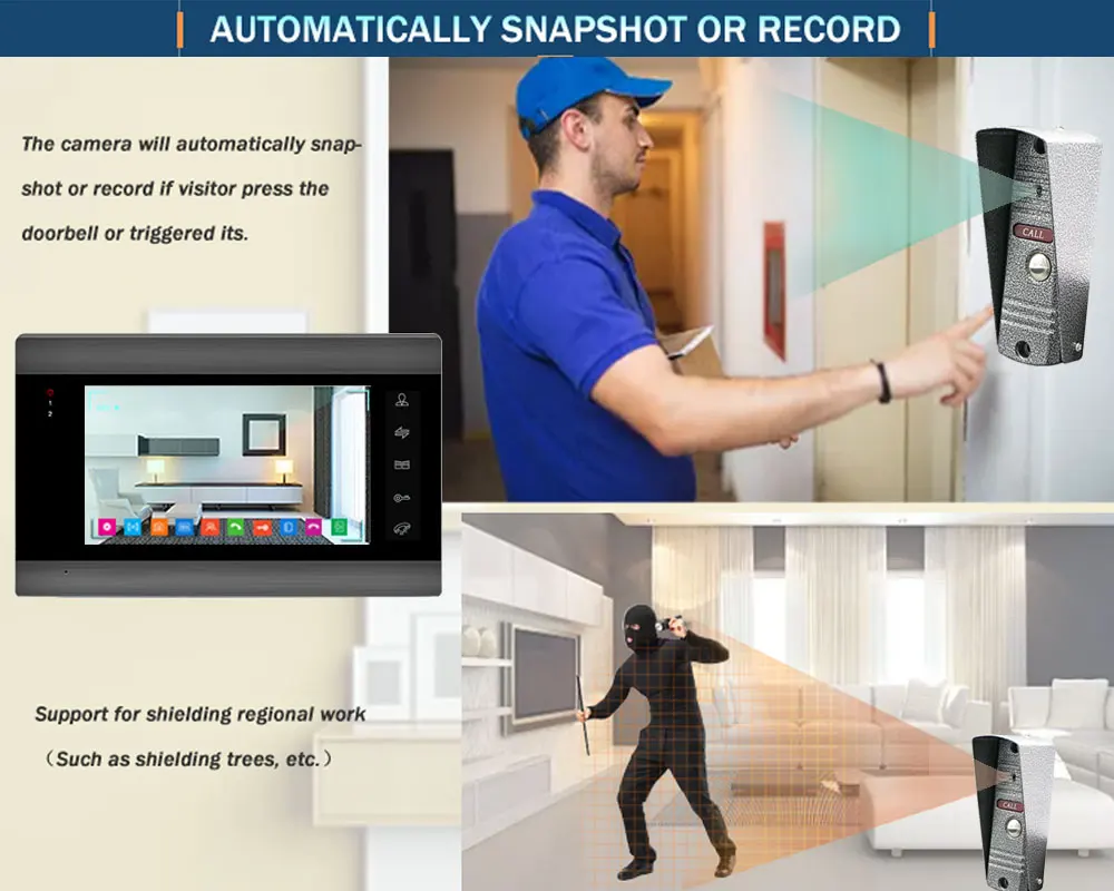 Это видеодомофон с функцией Wi-Fi, которая поддерживает работу с мобильными телефонами, когда Посетитель нажимает на дверной звонок, ваш телефон получит уведомление приложения, это означает, что вы можете использовать приложение для открытия двери, разговаривайте с посетителями, смотрите видео и так далее, когда Посетитель нажимает дверной звонок, ваш телефон получит уведомление приложения