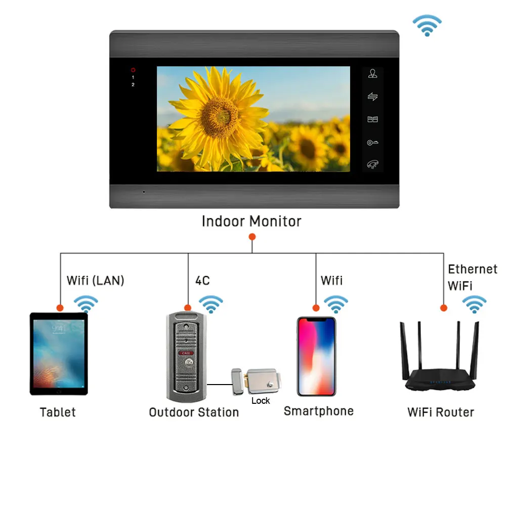 Обратите внимание, что система видеодомофона Wi-Fi не означает, что вам не нужен провод. Монитор поддерживает беспроводное подключение к Wi-Fi, но внутренний монитор и дверной звонок проводной, что гарантирует питание, видео работает стабильно, и вы можете увеличить расстояние