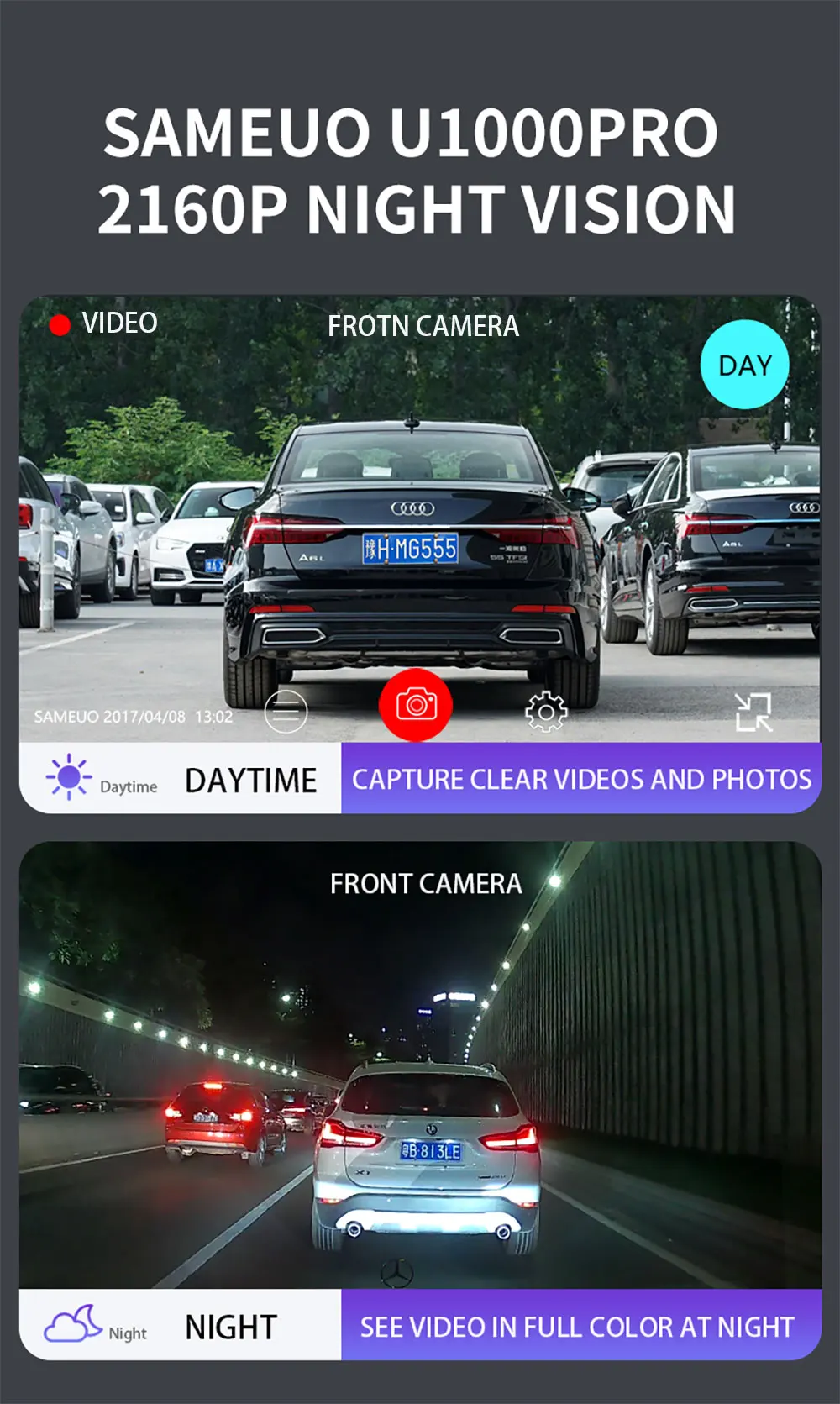 Видеорегистратор Sameuo U1000Pro, 4K, камера переднего и заднего вида для автомобиля UHD 2160P, видеорегистратор заднего вида, Автомобильный видеорегистратор 24 часа, монитор парковки