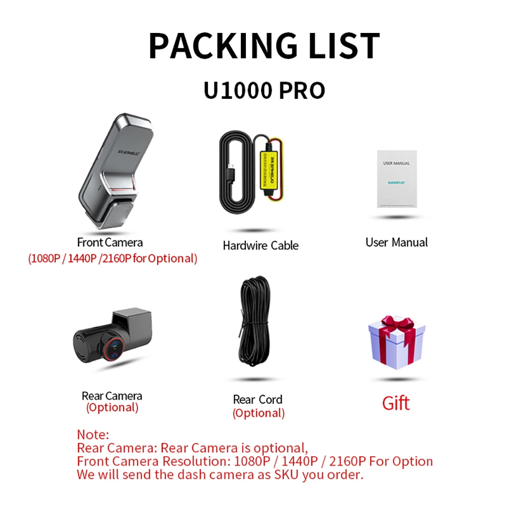 Модель: Sameuo U1000Pro SKU1: жесткий кабель 1440P SKU2: жесткий кабель 1440P + 1080P SKU3: жесткий кабель 2160P + (Пожалуйста, выберите какой Артикул вам нужен) Память: TF (до 64 ГБ) Чипсет: 1440P Novatek 96675 , 2160P Novatek 96670 ОЗУ: 2 Гб Видеокодек: H.265 Угол наклона: широкий угол 170 ° Чип изображения: Объектив Sony Разрешение видео: 2560X 1440 30 кадров в секунду и 3860X2160P 30 кадров в секунду Функция GPS: без GPS