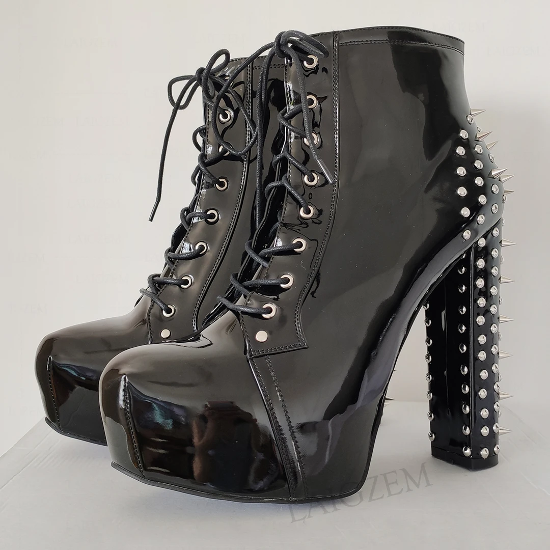 LAIGZEM с шипами; Женские ботильоны на платформе со шнуровкой, На высоких толстых каблуках; Блестящие черные лакированные туфли женские зимние сапоги большого Размеры 41 42-45, 47 (Европа)