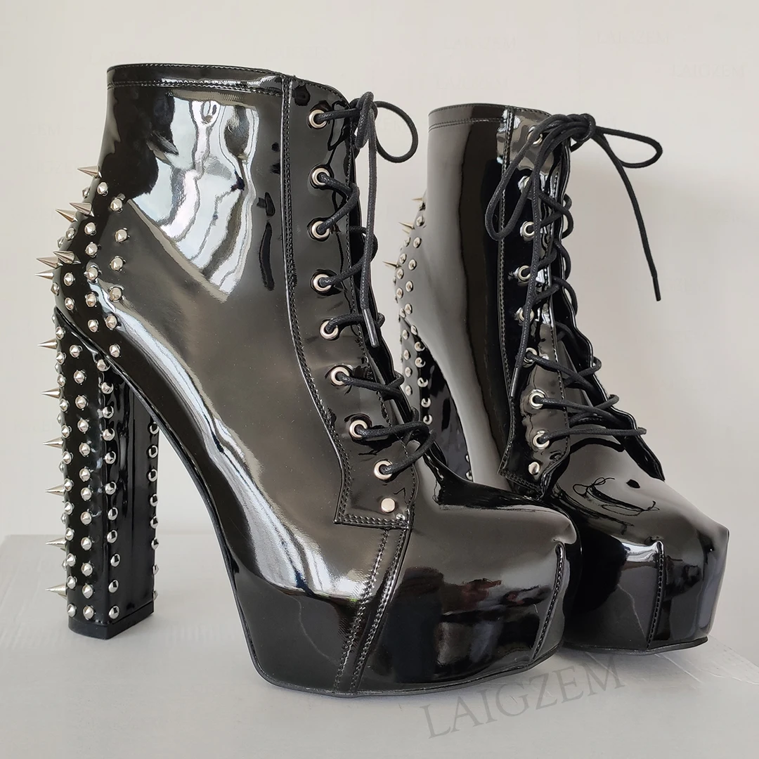 LAIGZEM/женские ботильоны на платформе с шипами; Ботинки на Высоком толстом каблуке со шнуровкой; Блестящая черная лакированная обувь; Женская обувь; Большие размеры 41, 42, 45, 47