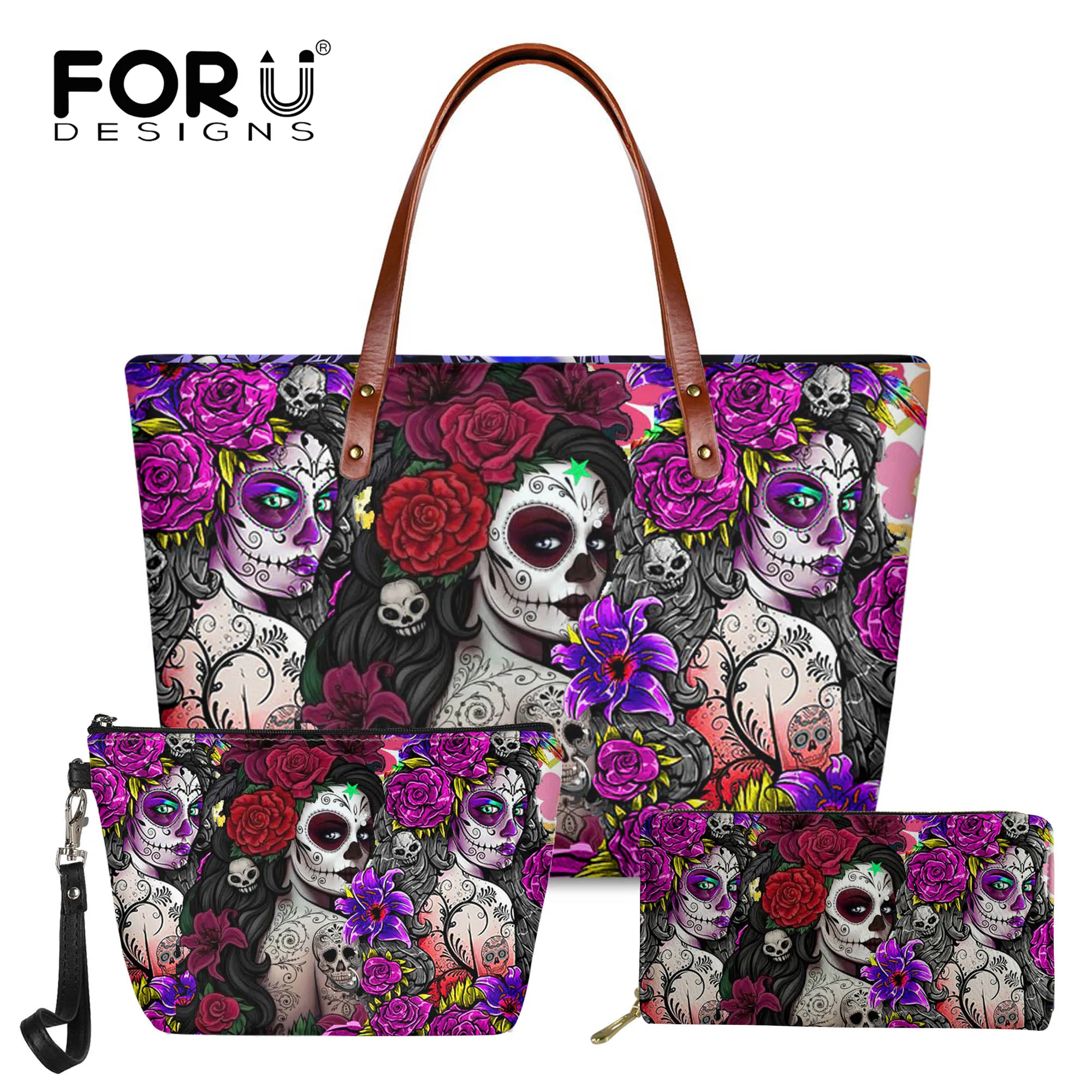 Модная Сумка-тоут FORUDESIGNS для девочек-подростков, кожаная Вместительная дорожная Сумочка на плечо с цветочным принтом черепа, дня мертвецов