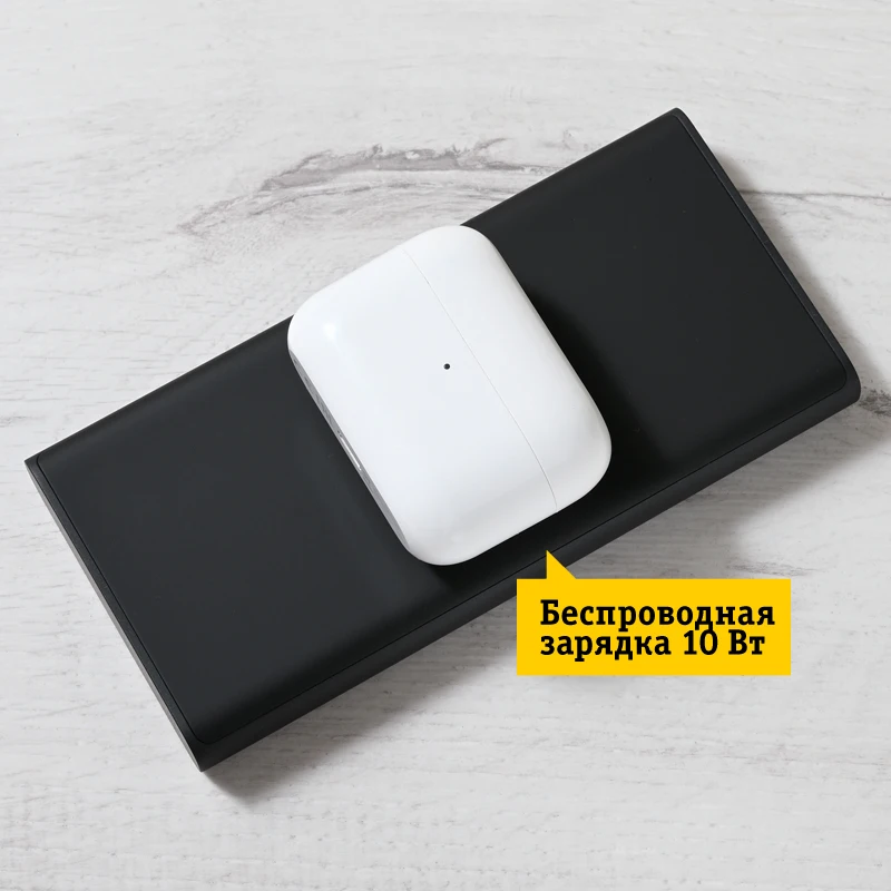 Xiaomi Mi Wireless Power Bank поддерживает быструю беспроводную зарядку мощностью 10 Вт, а также проводную зарядку из одного порта. Стандарт Qi позволяет использовать аккумулятор для беспроводной зарядки самых разных смартфонов, камер, приставок, ноутбуков и прочего оборудования. Умный чип автоматически распознает мощность и тип устройства, чтобы подобрать оптимальное питание для смартфонов и планшетов с поддержкой стандартов QC 3.0, QC 2.0. Цельный пластиковый корпус отличается высокой прочностью и устойчивостью к ударам. Он удобно лежит в руке благодаря скругленным граням. Особое нескользящее покрытие панели беспроводной зарядки обеспечивает превосходное сцепление с заряжаемым устройством и приятные тактильные ощущения.характеристики