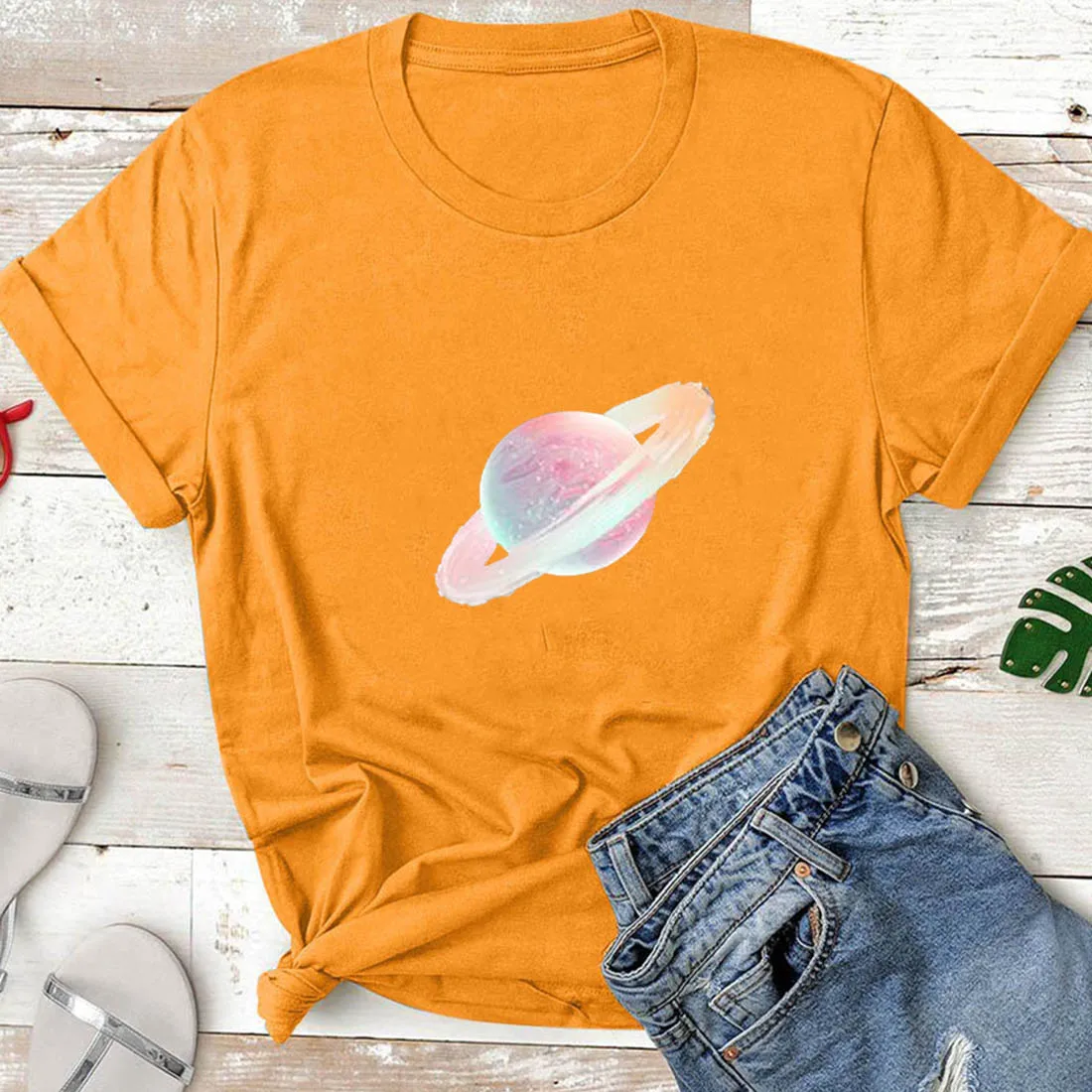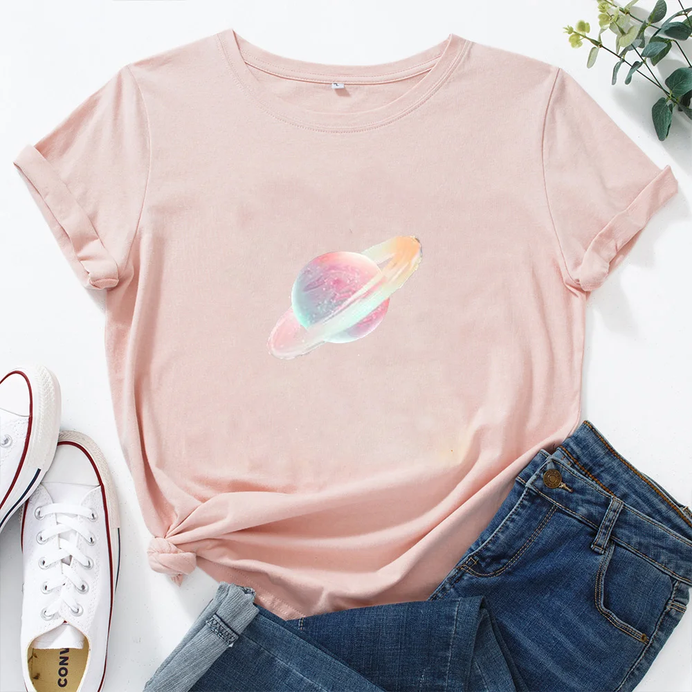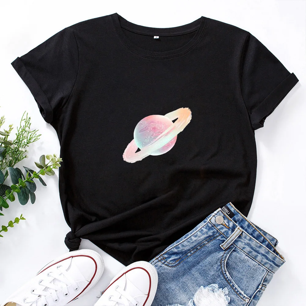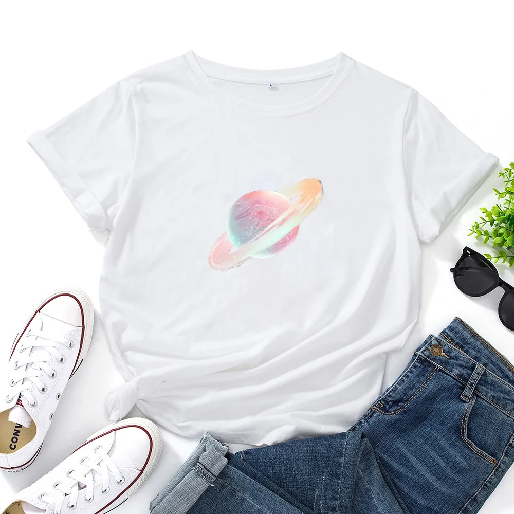 Футболка женская с графическим принтом, хлопковая рубашка с принтом планеты Галактики, звезд, Луны, летние топы с коротким рукавом, повседневная одежда