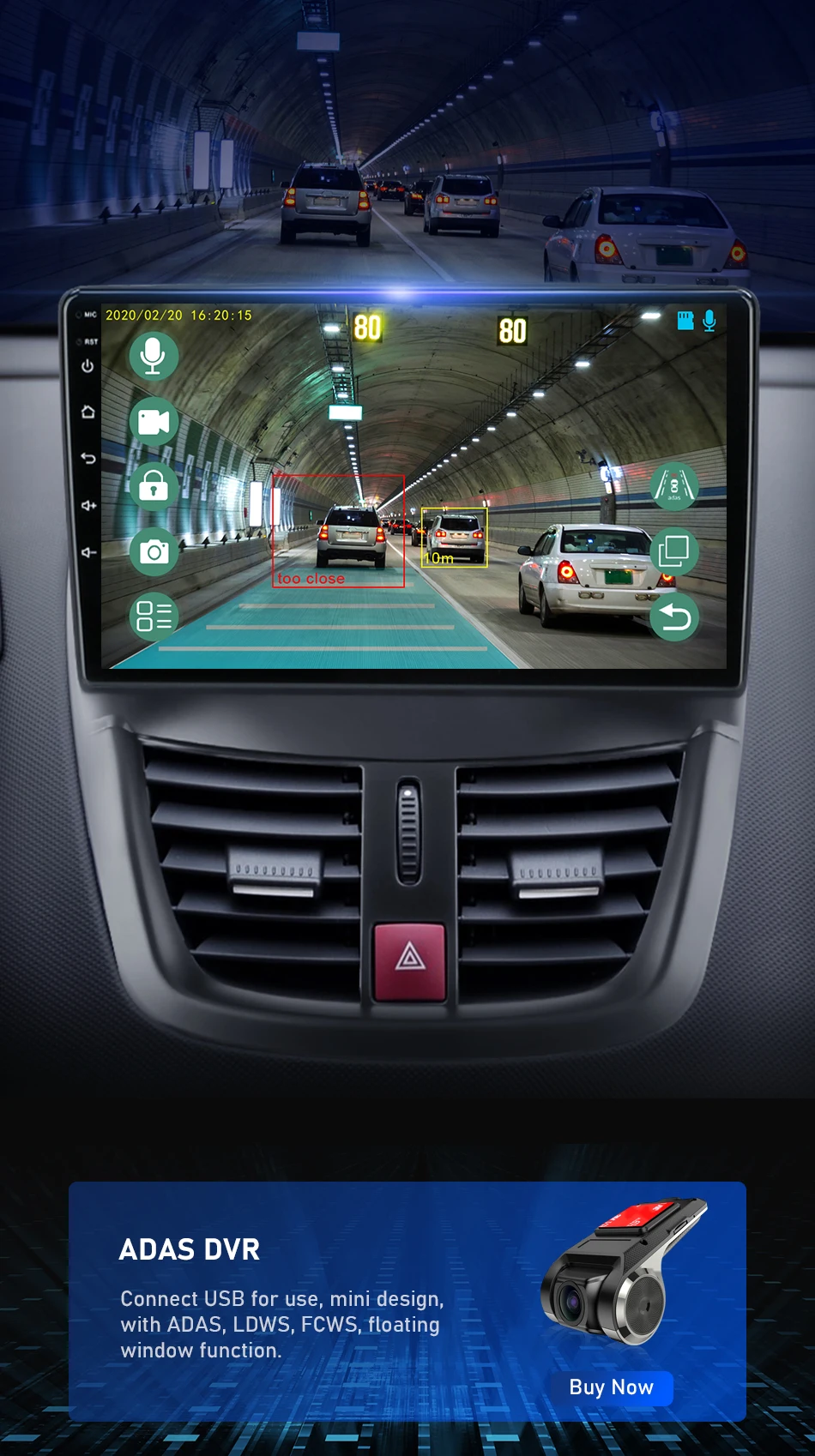 Поддерживает подключение к ADAS DVR. ADAS DVR имеет несколько встроенных технологий вспомогательного вождения, вставляя высококачественную карту памяти TF для записи каждого момента вашего вождения.