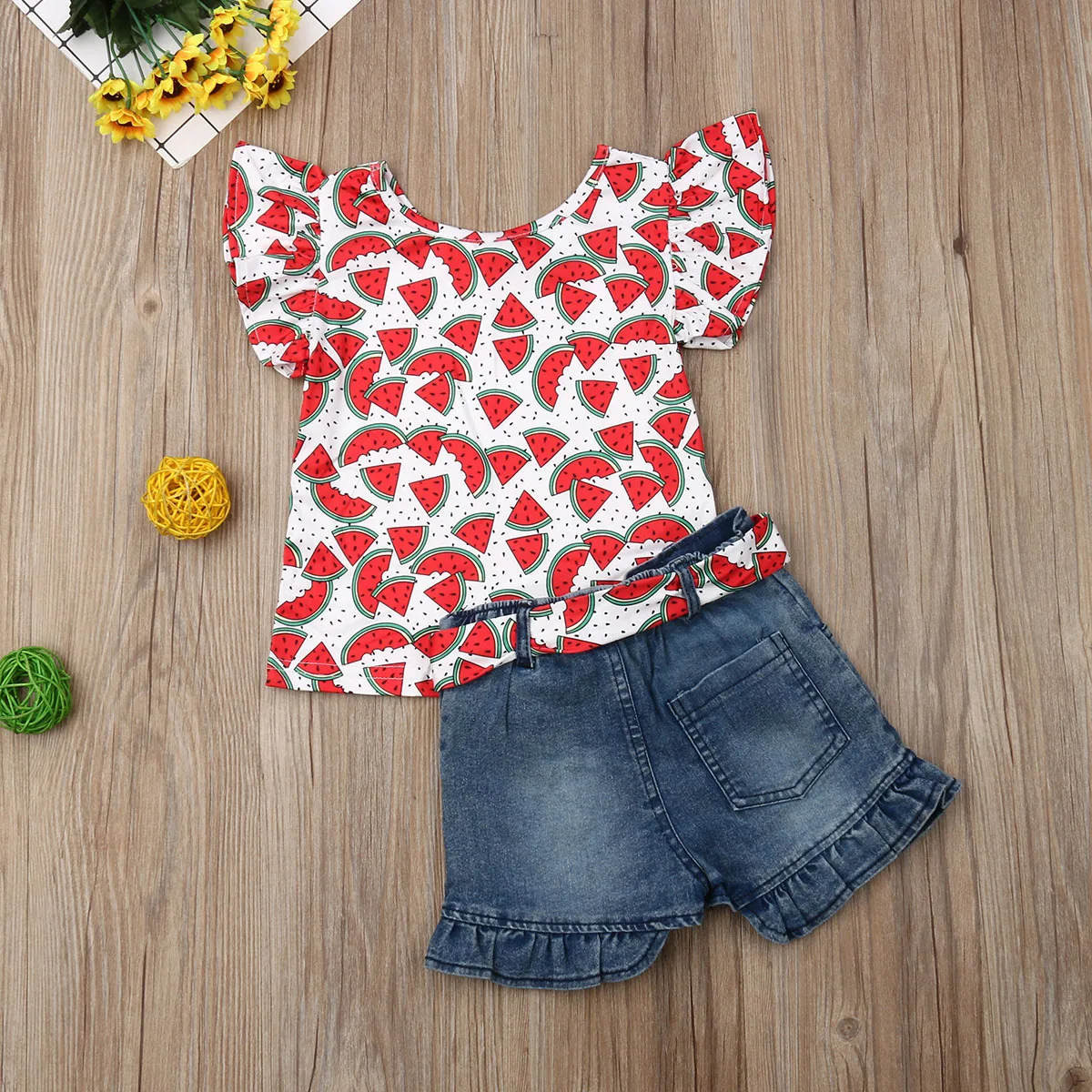 От 1 до 6 лет летние комплекты модной одежды для маленьких девочек топы с короткими рукавами и рисунком арбуза, фламинго, джинсовые шорты, комплекты из 2 предметов