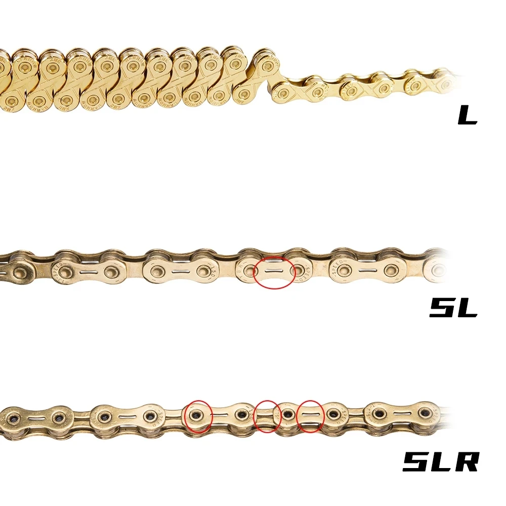 Звенья цепи ZTTO имеют гладкий радиус, без острых краев или фасок, которые обеспечивают значительное снижение шума, трения и износа на кольцах и кассетных болтах. Конструкция со скошенным штифтом также имеет лучшую мощность и большую общую прочность. Покрытие нитрида титана на золотых цепочках уменьшает коррозию и уменьшает трение.