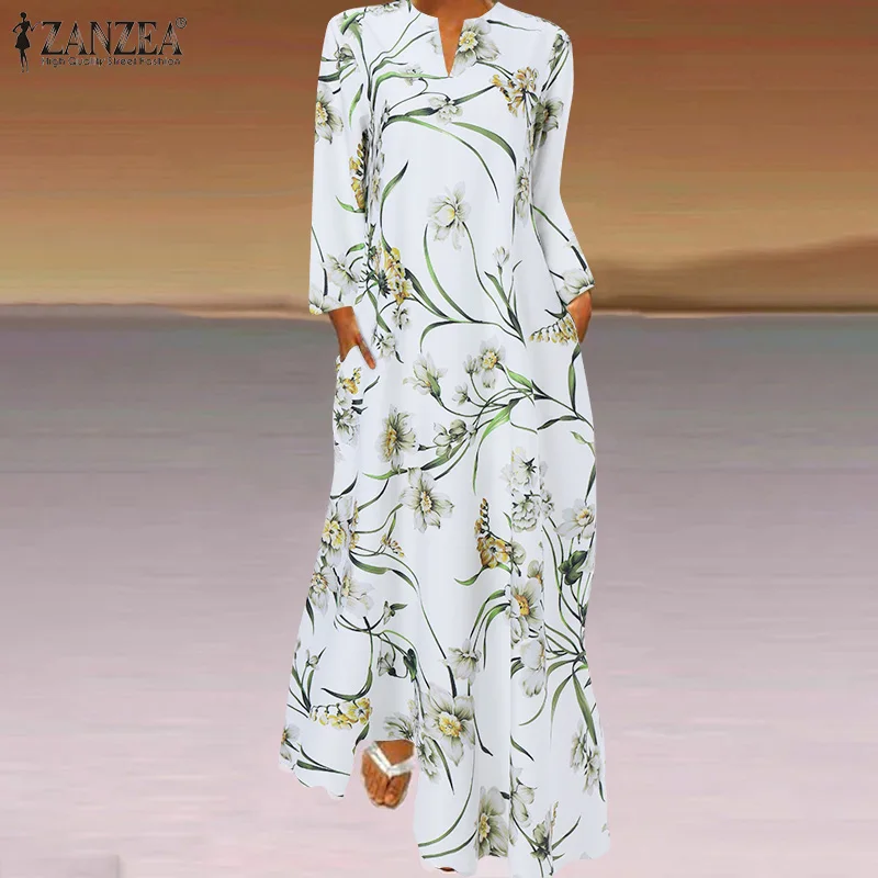 Богемный сарафан с длинным рукавом и цветочным принтом 2021, женское летнее длинное платье ZANZEA, элегантное вечернее платье, кафтан, оверсайз S-