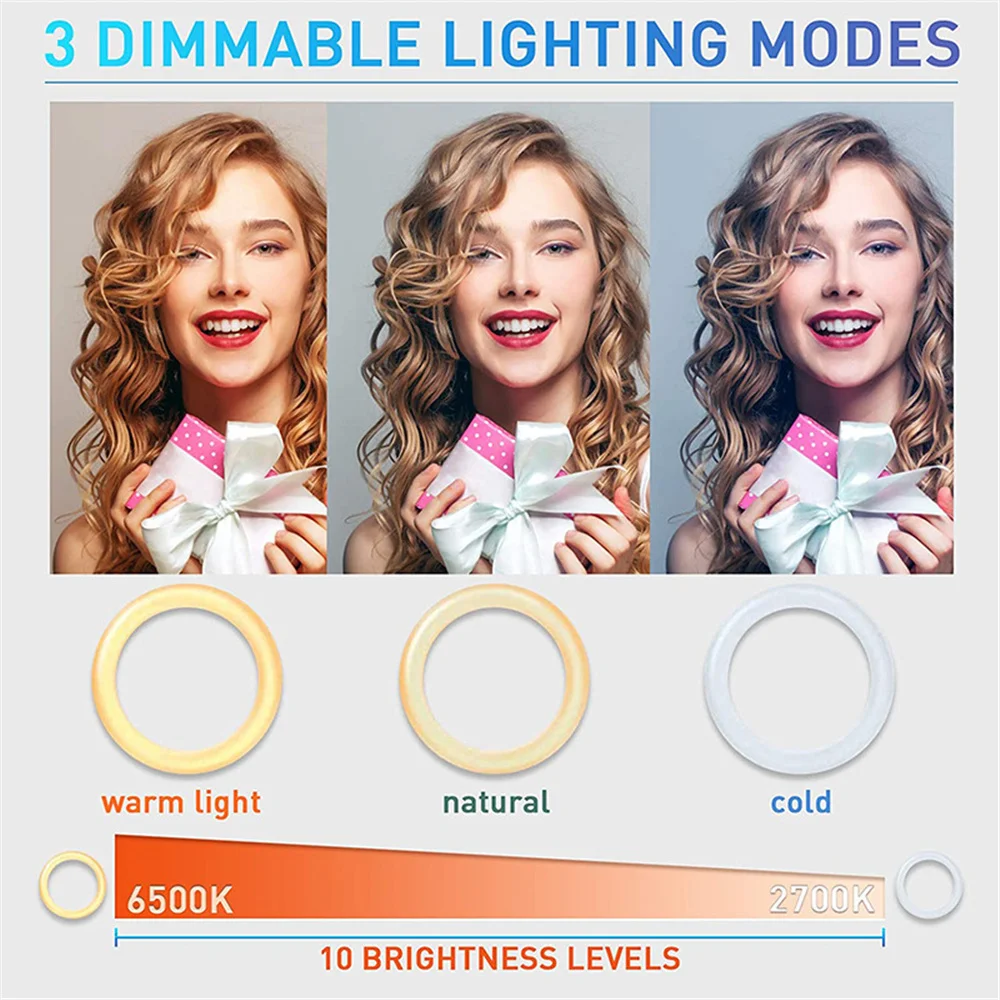 【 3 цвета светильник режим ing и 10 яркость уровень 】наш светодиодный светильник кольца имеет 3 Светильник цвета-теплый, нейтральный светильник, белый. Каждый режим освещения имеет 10 различных яркости и 48 Светодиодный ламповых бусин. Цветовая температура регулируется от 2700k до 6500K. Яркие цвета могут создать уникальную атмосферу и удовлетворить ваши различные потребности.