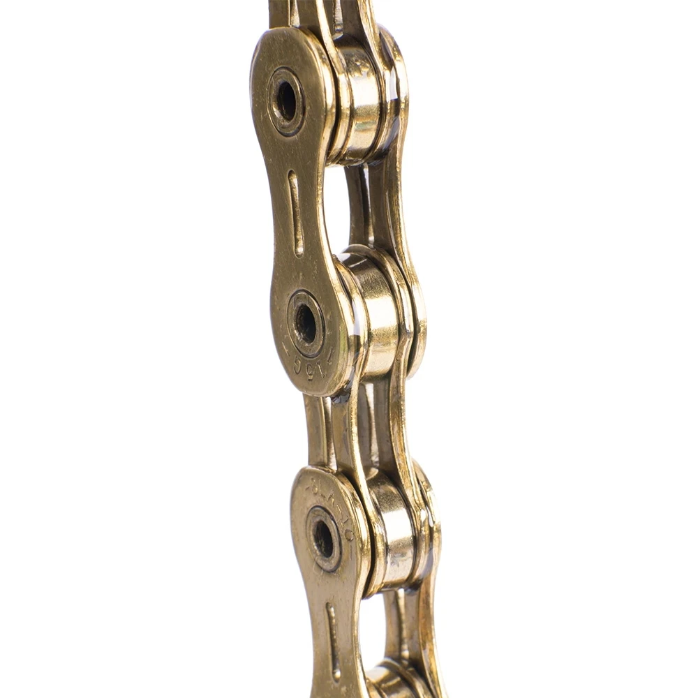 Замыкание: многоразовый нитрид титана PVD Gold Внешняя пластина: никель + нитрид титана PVD Gold Внутренняя пластина: хромированная + нитрид титана PVD Gold Обработка штифта: хромированный закаленный штифт Скорость S: 10 скоростей Длина цепочки: 116 звеньев Цвета: золотое покрытие нитрида титана Совместимость: SHIMANO, Campagnolo и SRAM 10 скоростные системы трансмиссии Вес: около 270 г