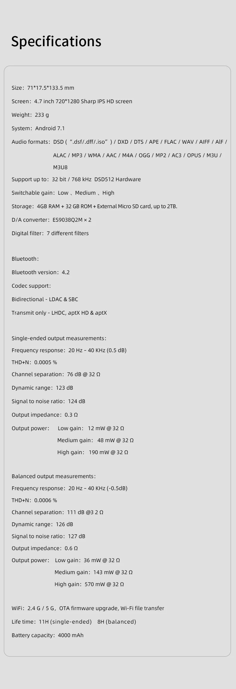 Новые возможности с открытым Andriod OSВосьмиядерный процессор Qualconmm Snapdragon 430M6- Dual AK4495SEQ DAC, M6(21) - Dual ES8038Q2M DAC2,5 мм/3,5 мм/4,4 мм выходы32 бит/768 кГц, M6- DSD256,M6(21) - DSD5124 ГБ ОЗУ, 32 Гб ПЗУ, внешняя карта Micro SD до 2 ТБДвухсторонняя Bluetooth, встроенный 10-полосным эквалайзеромM6 Ver.21 - MQA - 8x разворачивающийсяЧто отличается на M6 (21)?-Пара DACs ESS Sabre ES9038Q2M-Новая схема усилителя для перехода с этим новым DAC-Поддержка MQA-Доступны только как черный корпус с золотым колесомM6 (21) поддерживает MQA, может ли это быть добавлено к оригиналу M6?Нет, это невозможно. MQA Сертификация связана с M6 (21) и его аналоговой схемой, она не может быть использована для оригинального M6.