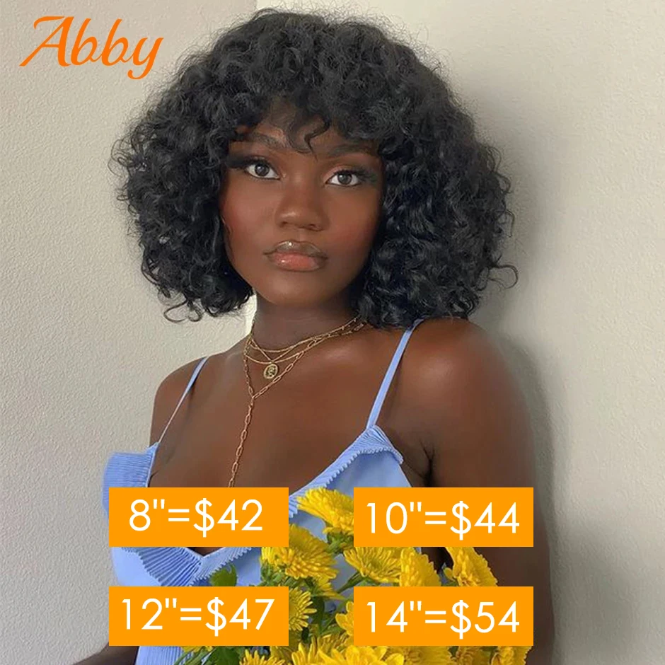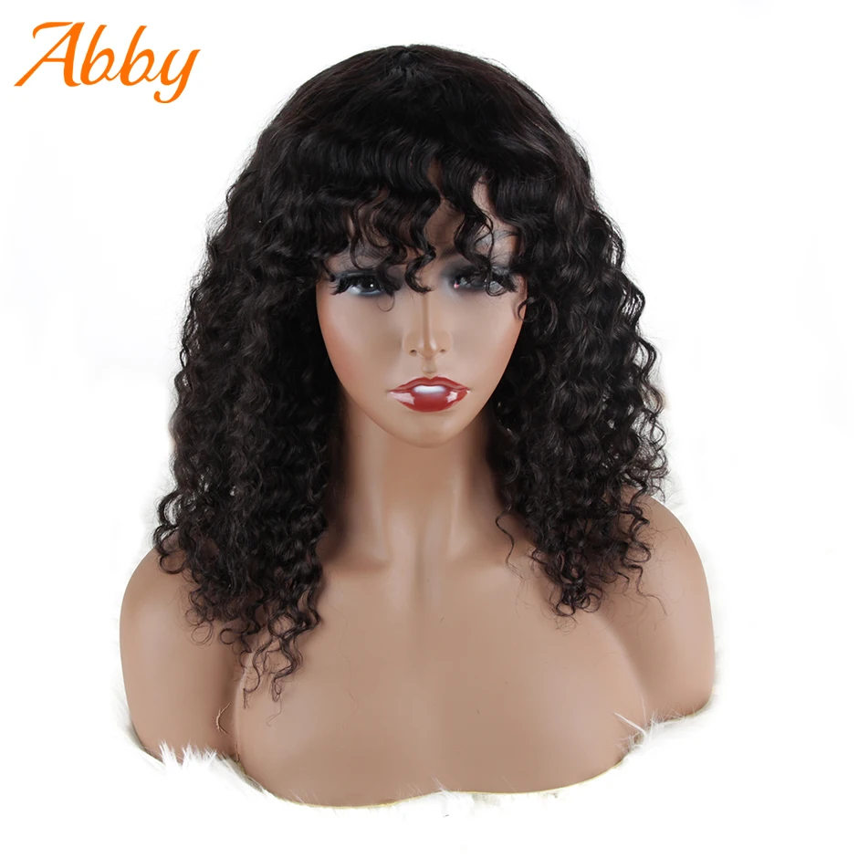 Парики с глубокой волной с челкой, перуанские парики с глубокой волной для женщин, человеческие волосы без клея, плотность 180%, парики машинной работы, без клея, Эбби