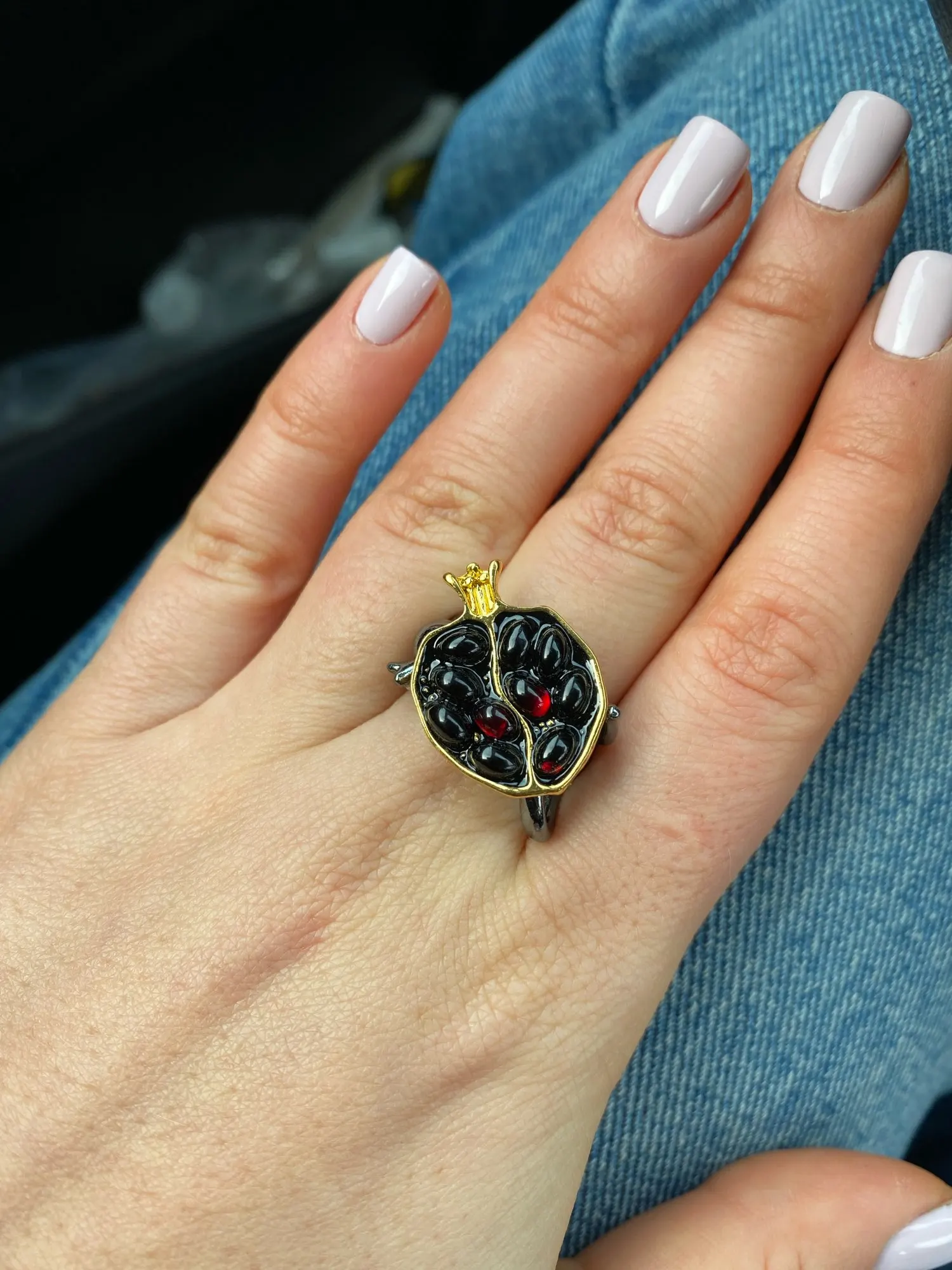 На фотографии - оригинальная идея, пришла жалкая копия. Кольцо покрыто блестящим чёрным лаком, никакой гравировки на деталях нет, гранатовые зёрнышки пластиковые, между ними просто заливка. В маленьком плоде не красный страз, а приклеенный прозрачный. В общем, огорчение. Доставка быстрая, упаковка надёжная. Это без претензий.