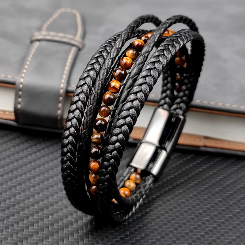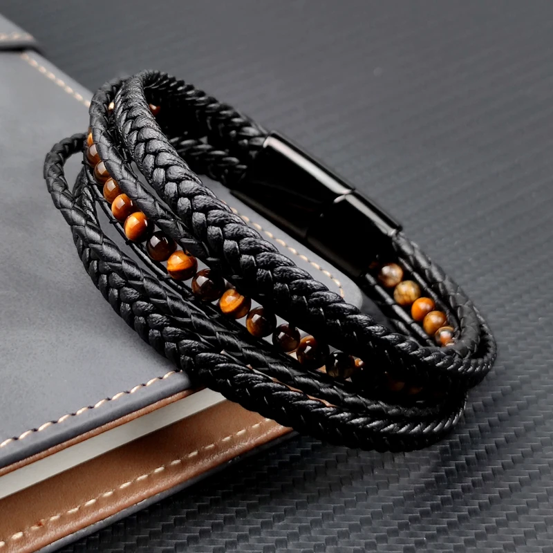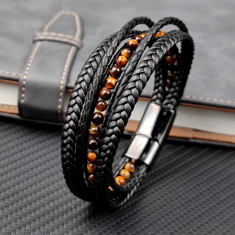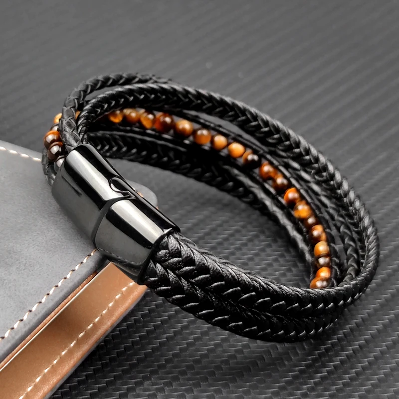Модный мужской браслет из натурального желтого тигрового глаза с бусинами плетеные кожаные браслеты из нержавеющей стали с магнитной застежкой мужские ювелирные изделия подарок
