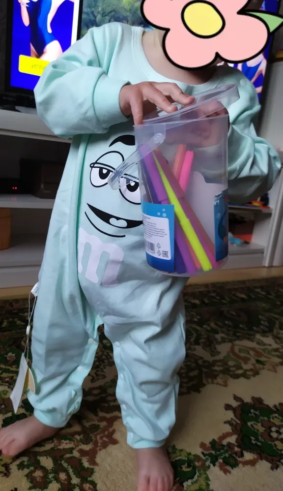 Доставка всего 2 недели, очень быстрая в пункт выдачи. Комбинезон хоть и синтетика, но смотрится потрясающе. Кнопочки находятся там где нужно, в 2х местах. Продавец честный, брала без отзывов всё отправил Советую однозначно Р с. По размеру не подскажу, так как брала на вырост