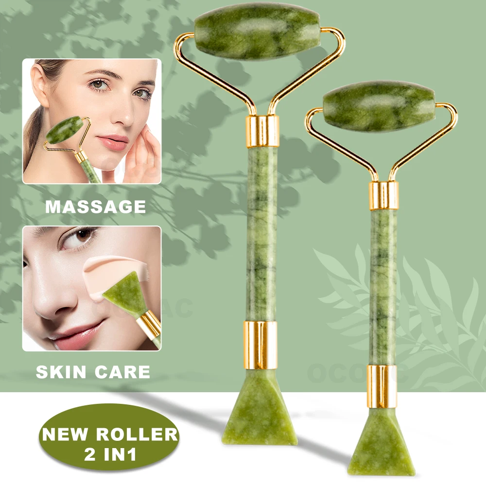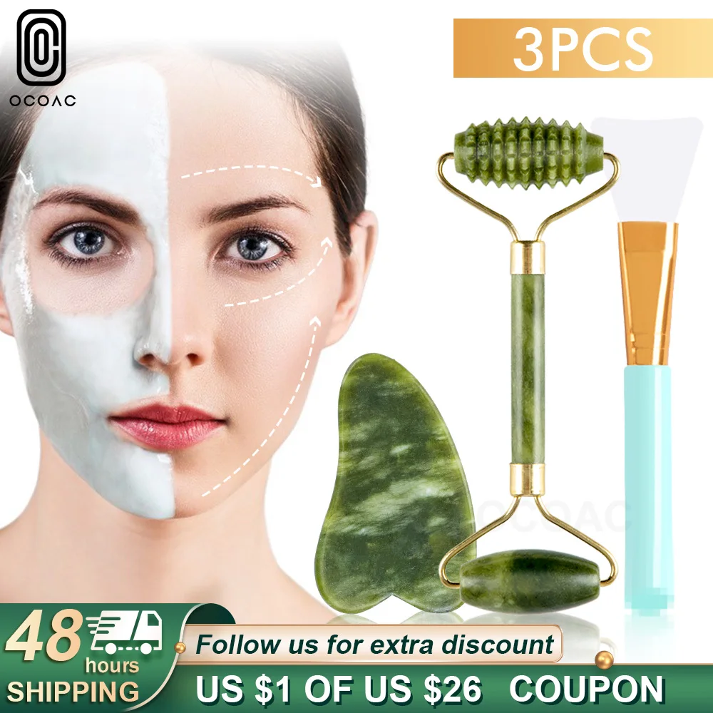 Нефритовый роллер-массажер для лица, 3 шт., Зеленый Натуральный гуашевый скребок для лица, для красоты тела, спины, ухода за кожей, массажеры для похудения