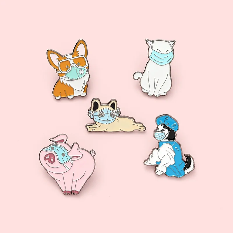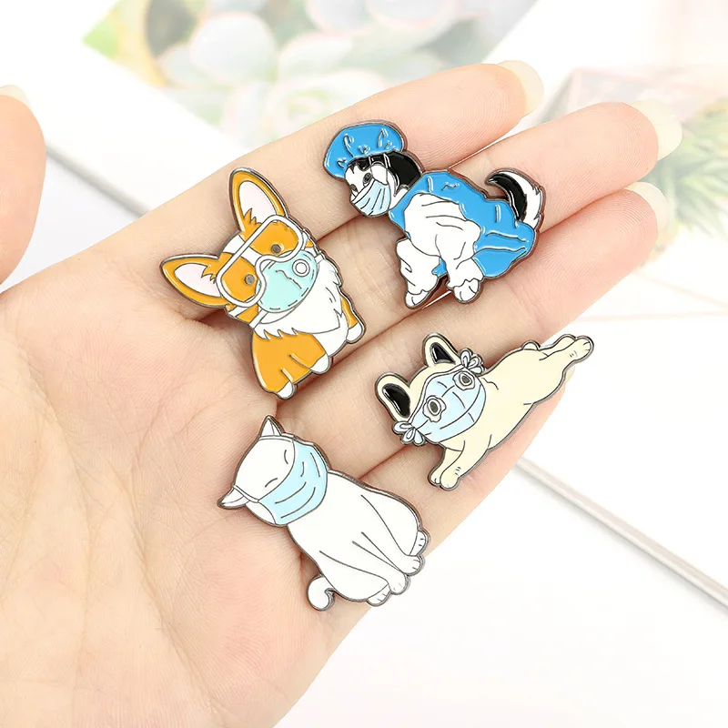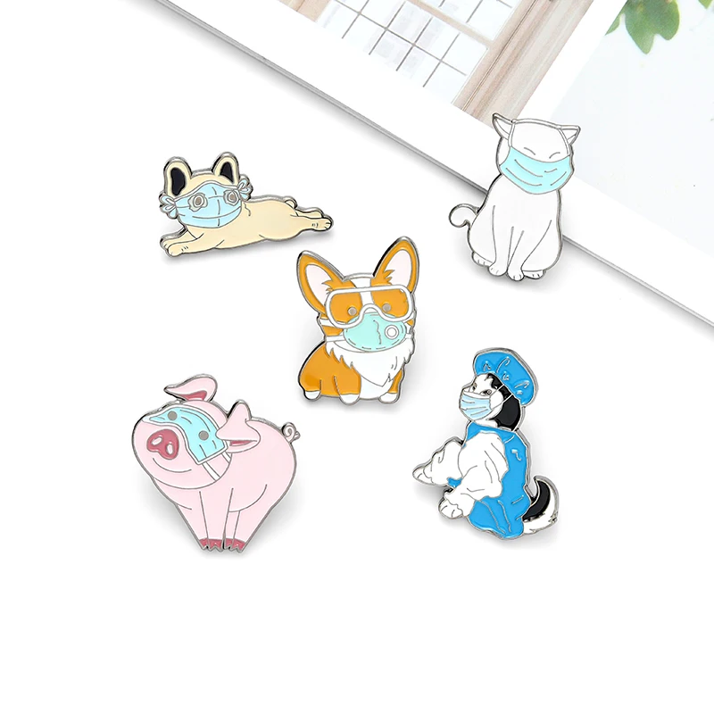 Животные в одежде противоэпидемической маски эмали штырь корги Соба...