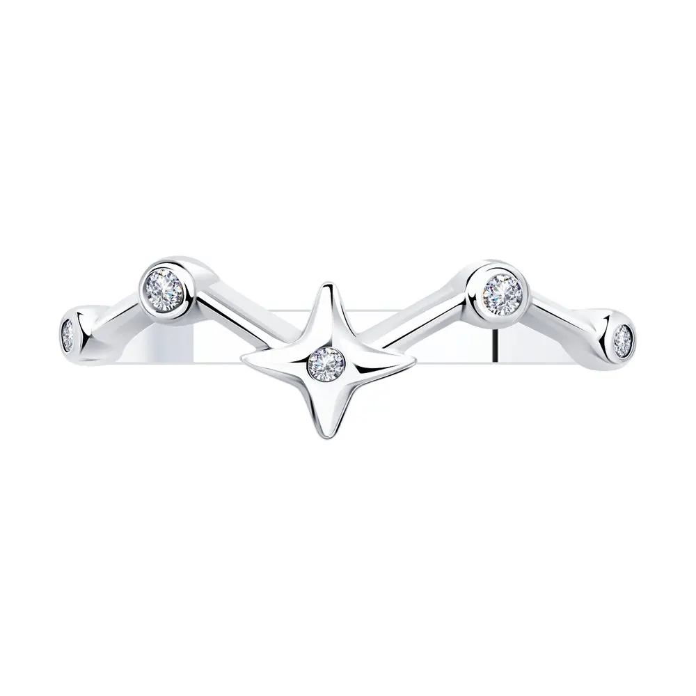 Кольцо SKLV из серебра с фианитамиСияй ярче звёзд вместе с поистине космическими украшениями SKLV! Серебряное кольцо с созвездием привлекает взгляды неординарным дизайном в стиле трендового минимализма. Сияющие фианиты расставляют блестящие акценты в образе. Меняй посыл самых скучных повседневных луков, привнося в них совершенно новую эстетику.