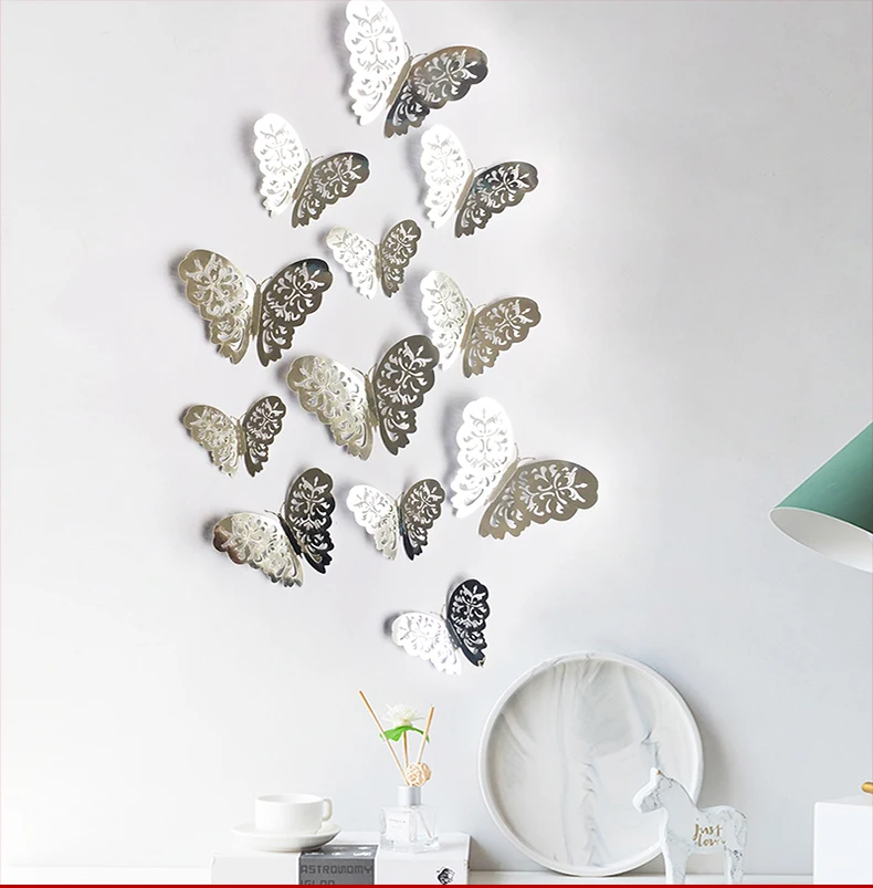 Материал: бумага Размер: 12 см/10 см/8 см Цвет: розовое золото/серебро Тип: как на фото Применение: Сложите крылья, чтобы создать 3d-эффект, используйте двусторонний клей, чтобы приклеить к стене. Количество: 12 шт./компл.