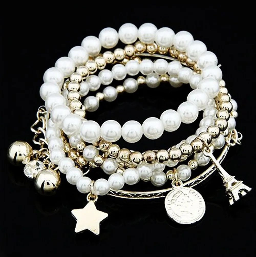 6 шт богемные Многослойные жемчужные бусины Эластичный Браслет Золотая Эйфелева башня звезда кулон браслет оптовая продажа браслет для женщин