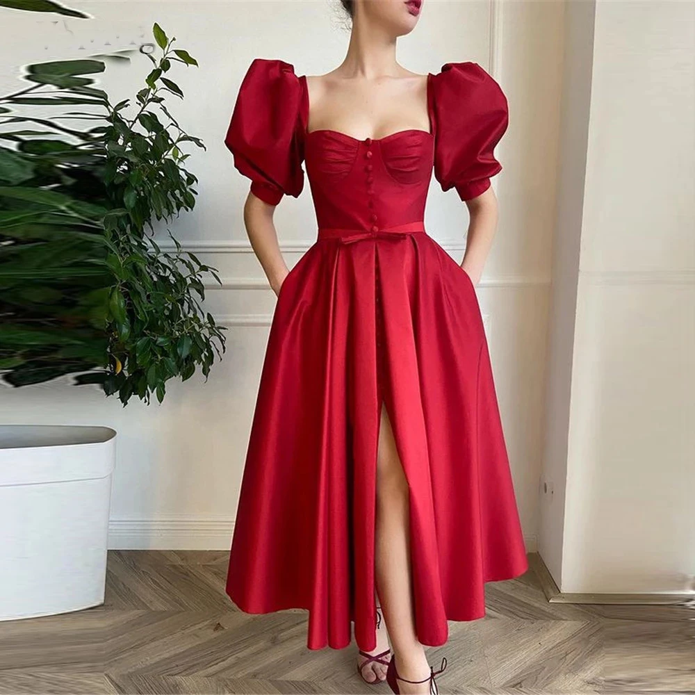 Платье вечернее ТРАПЕЦИЕВИДНОЕ из тафты, простая плиссированная юбка с короткими рукавами-фонариками, на пуговицах, с разрезом спереди, для выпускного вечера, винного цвета