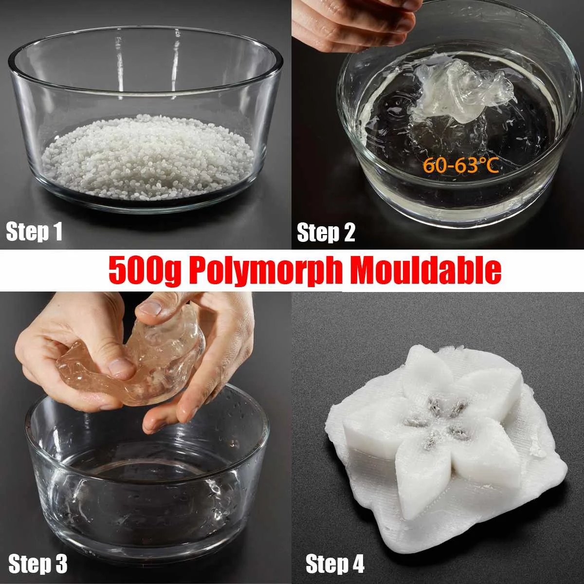 Благодаря нагреванию полиморфных термопластичных свойств, из твердых белых частиц в прозрачную мягкую глину. Когда полиморф термопластичный охлаждается до комнатной температуры, он становится белым и таким же твердым, как каменная модель, полиморф термопластичный снова после нагрева и охлаждения может быть повторно использован много раз.