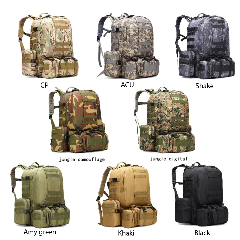 Размер: Основная сумка: высота 48 см, толщина 20 см, ширина 30 см Передняя сумка: высота 34 см, толщина 7 см, ширина 30 см Боковая Сумка: высота 20 см, толщина 7 см, ширина 13 см Поясная сумка: высота 16 см, толщина 12 см, ширина 35 см Цвет:Черный, хаки, армейский зеленый, ACU, CP, Jungle Digital,Black Snake Материал: Оксфорд Применение: альпинизм, туризм, кемпинг, открытый и т. Д. Описание: Adjustable Регулируемый значок и пояс Velcro липучка изготовлена из высококачественных материалов, которые могут адаптироваться к различным суровым условиям Fasteners крепежные детали изготовлены из высококачественных пластиковых крепежных элементов, которые устойчивы к высоким температурам, холоду и давлению удара и плавно сочетаются для обеспечения быстрого освобождения ◎Все молнии разработаны с двумя молниями, что значительно продлевает срок службы и удобнее в использовании ◎На лямках используется высококачественная нейлоновая тесьма, которая устойчива к истиранию, обладает высокой прочностью, не легко ломается и чувствует себя хорошо ◎Система лямки MOLLE добавляется к передней, нижней, боковой, включая широкие плечевые ремни сумки, которые могут легко установить различные вспомогательные инструменты для сумки, что более удобно и быстро использовать. Он используется для велоспорта, альпинизма, пеших прогулок, походов по пересеченной местности, путешествий, полевых игр и других видов активного отдыха на свежем воздухе